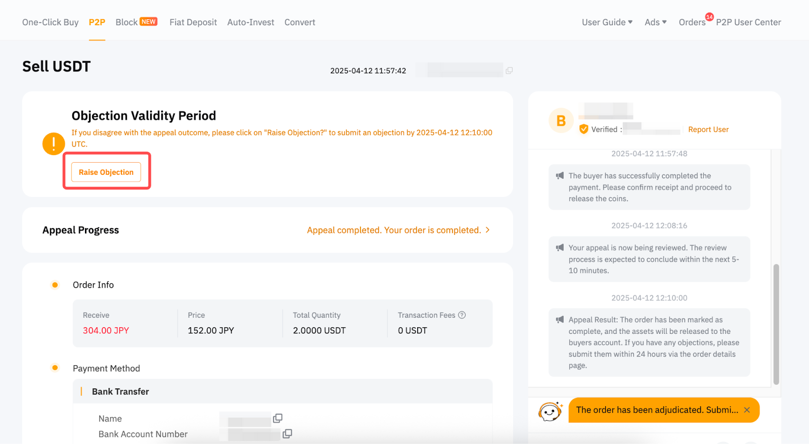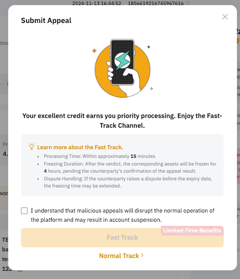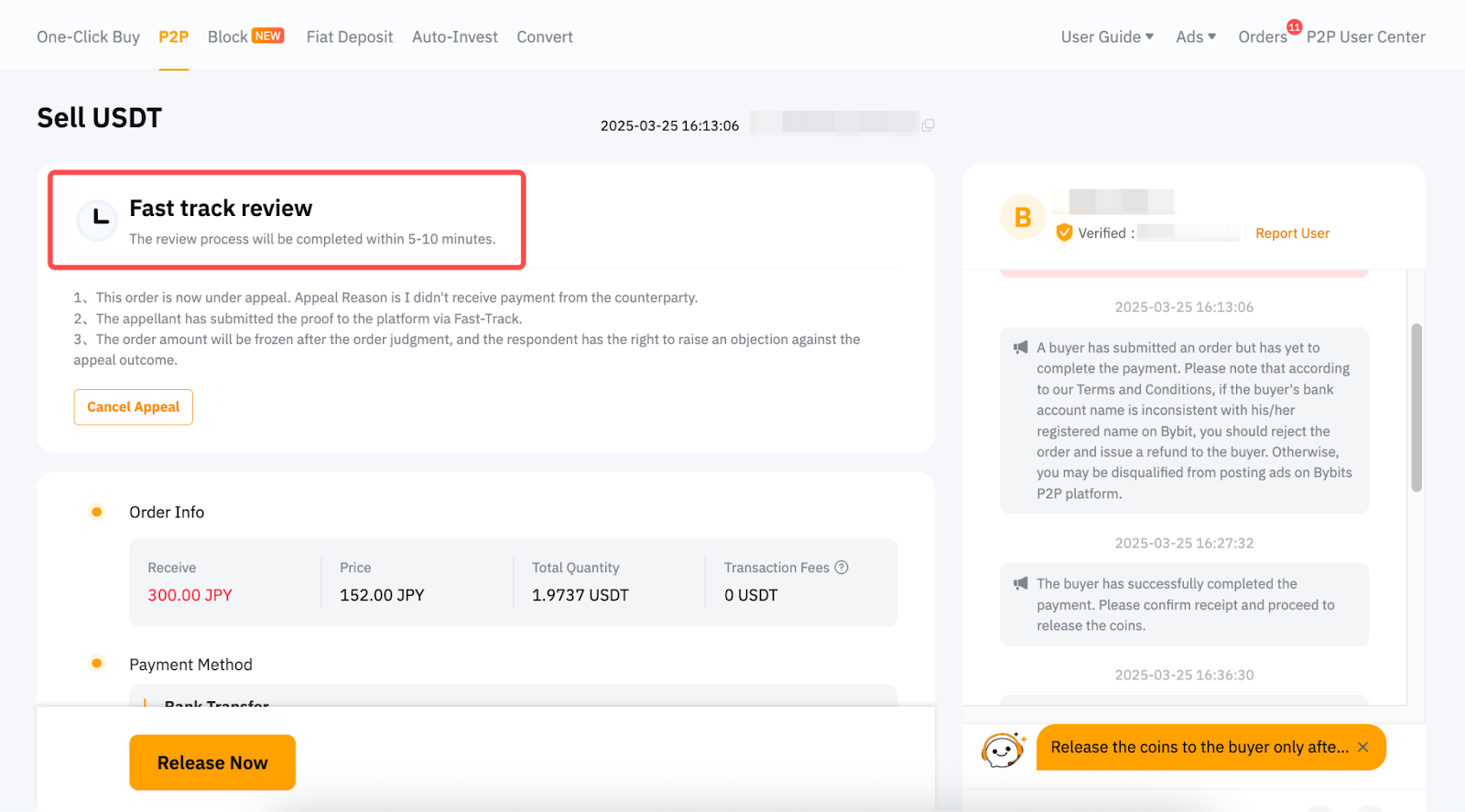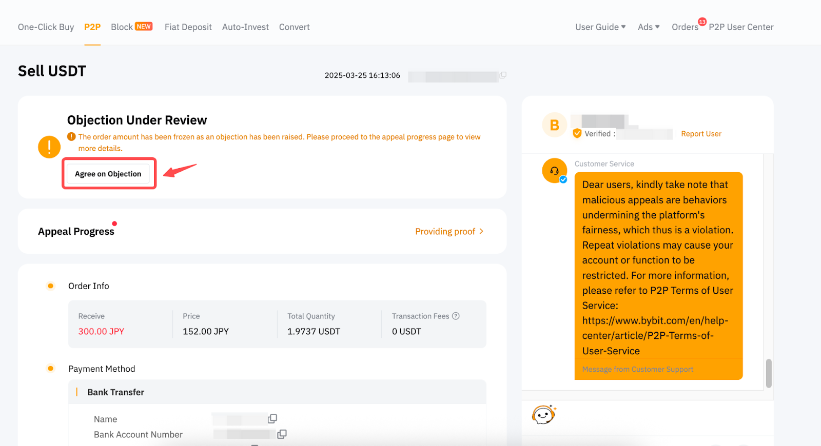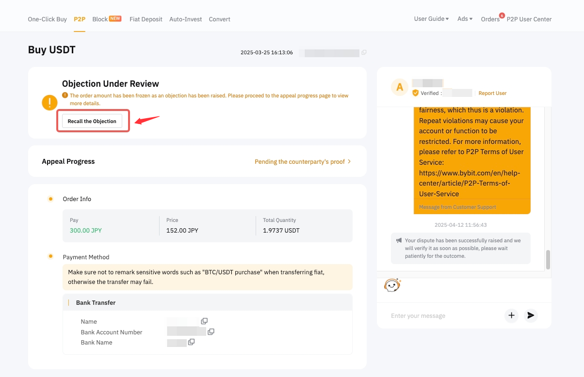 Арнайы P2P тәуекелі және апелляциялық маманы апелляцияңызды сәтті жібергеннен кейін сізге бірінші келген, бірінші шығыс (FIFO) негізінде әрі қарай көмектесу үшін болжалды уақыт ішінде P2P тапсырысы бойынша сөйлесу жолағына қосылады. Апелляцияңыздың автоматты түрде жойылуына жол бермеу және оның біркелкі өңделуін қамтамасыз ету үшін олардың нұсқауларын орындаңыз.