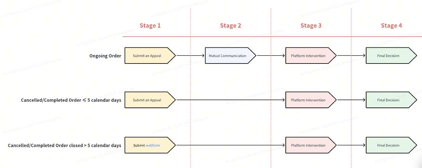 Апелляция процесі тапсырыс күйіңізге байланысты әр түрлі болады. Апелляцияға қажетті қадамдарды және ісіңізді тиімді шешу үшін қосымша ақпаратты түсіну үшін төмендегі диаграмманы қараңыз.