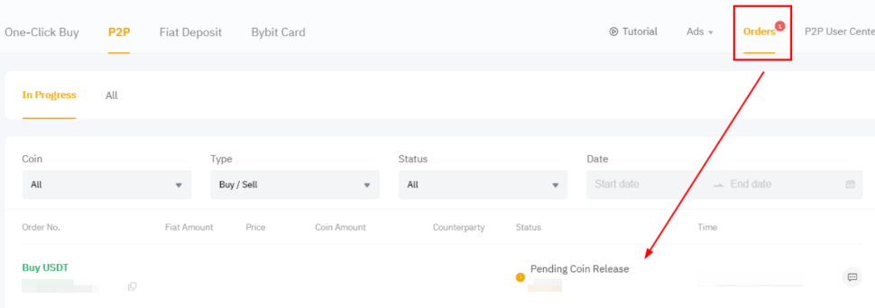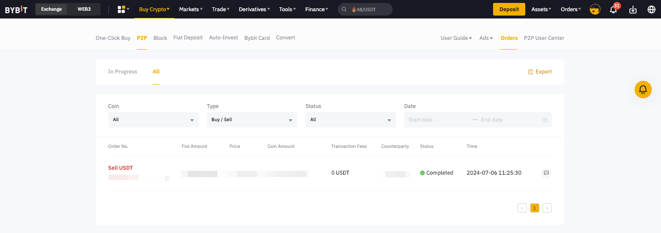 түймесін басыңыз Crypto → P2P саудасы → тапсырыстарды сатып алыңыз. Сіз тапсырысты көресіз Орындалуда, Бас тартылды, немесе Аяқталды.