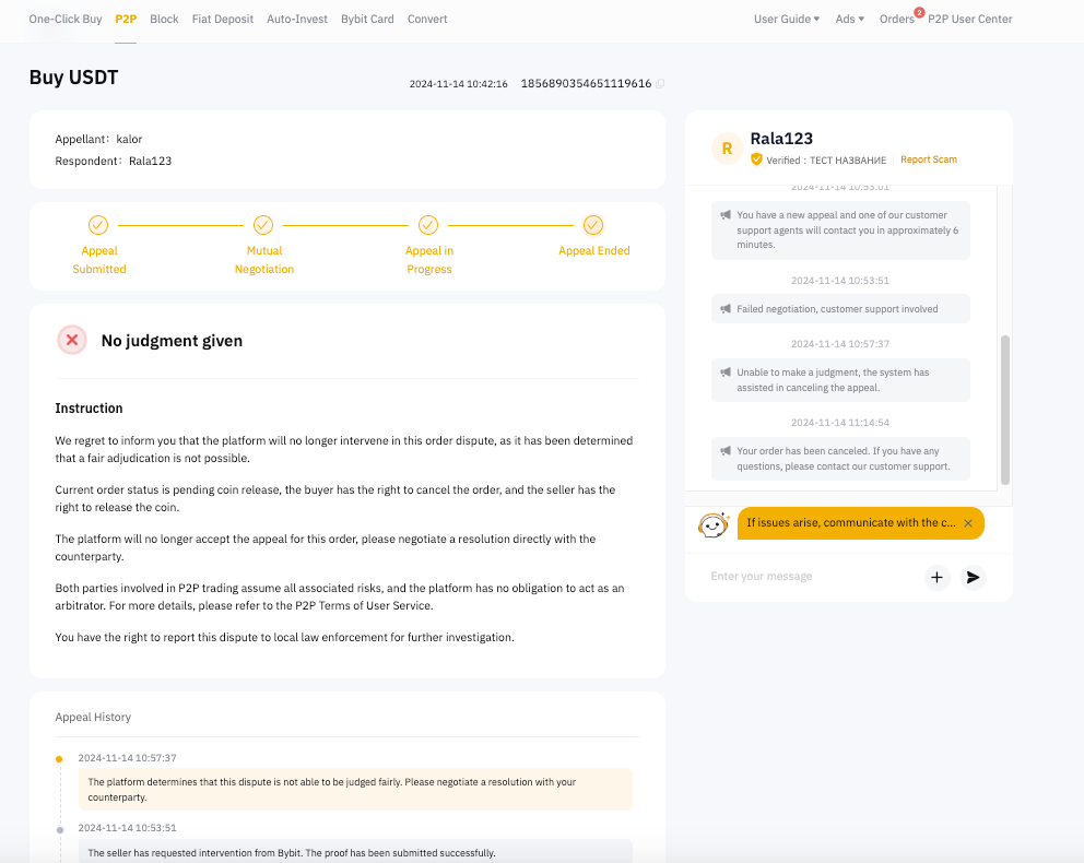 Шешім 15 минут ішінде қабылданады және P2P апелляциялық маманы чатқа қосылмайды. басыңыз Апелляция барысы күйін тексеру үшін.