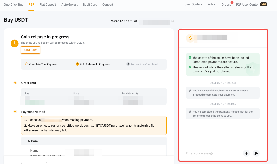 Біз пайдаланушыларды алаяқтық емес сценарийлерде контрагентпен байланысу арқылы мәселені шешуге шақырамыз. Басу арқылы Сатушыға хабарласыңыз/Сатып алушыға хабарласыңыз, бетіндегі Тапсырыс чат өрісі арқылы контрагентпен байланысуды бастай аласыз P2P тапсырыстар беті.