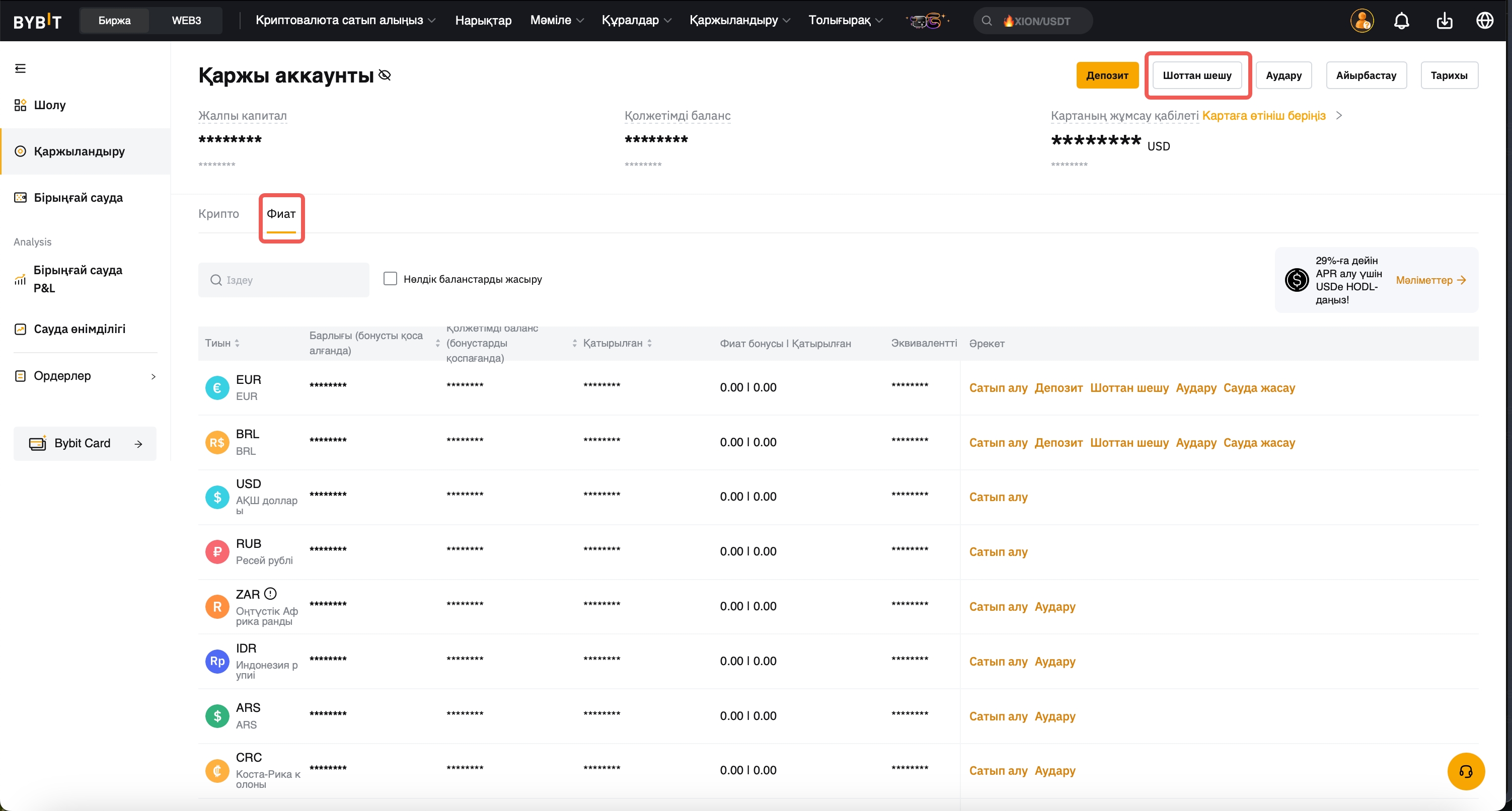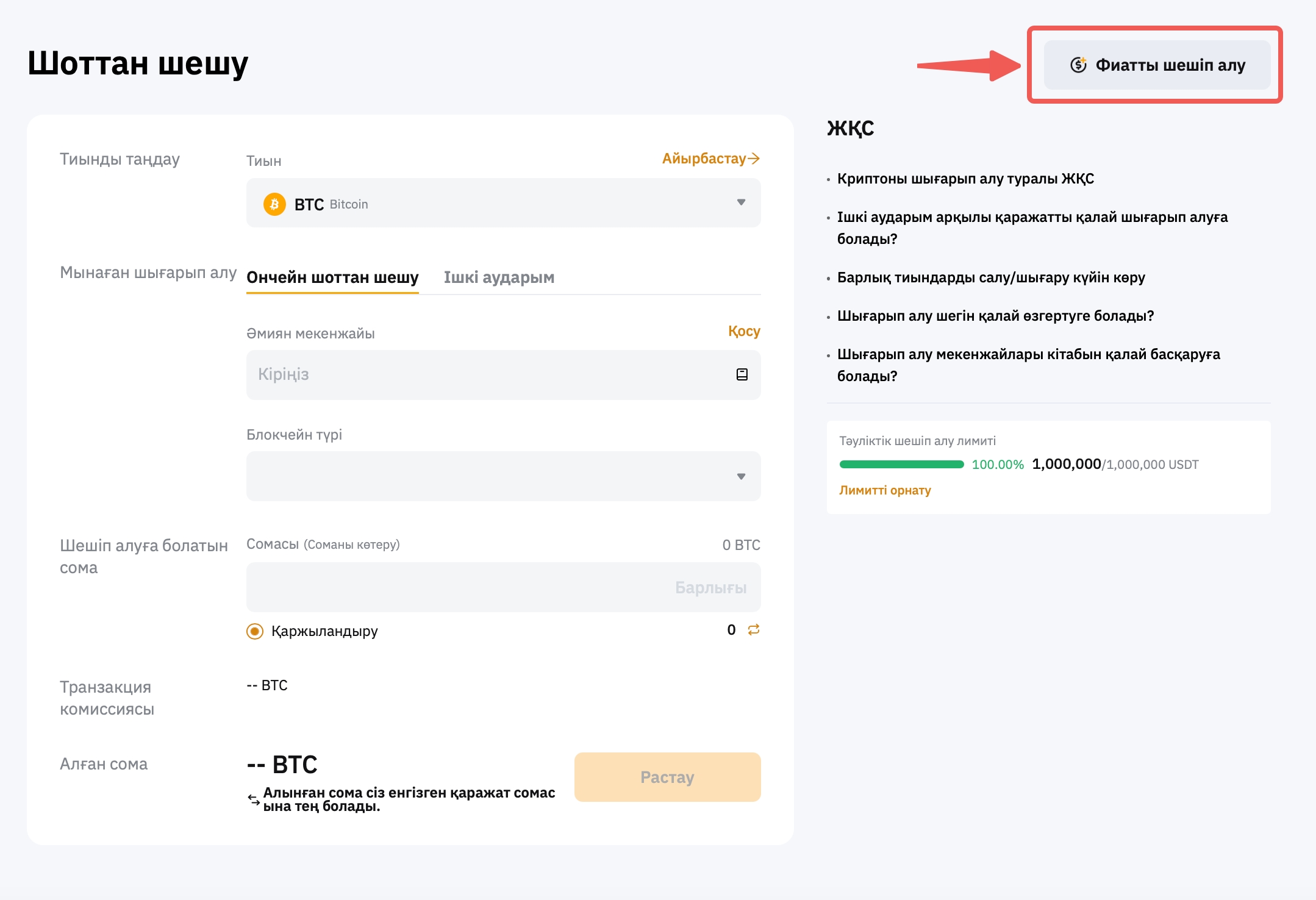 Фиаттық валютаңызды шешіп алу үшін Қаржыландыру аккаунты → Фиатты шешіп алу тармағына өтіңіз. Әртүрлі фиаттық валюталарда қаражаттарды шешіп алудың прцоедуралары аздап ерекшеленеді. Қосымша мәліметтер алу үшін мұнда кіріңіз.