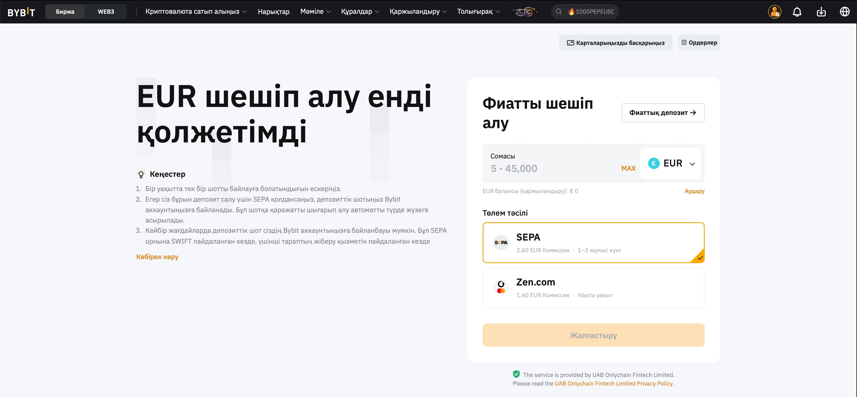 Bybit сізге фиат балансы арқылы лезде сауда жасауды жеңілдету үшін фиатты депозиттеулердің әртүрлі жолдарын қамтамасыз етеді. Әртүрлі фиаттық валюталарда қаражаттарды депозиттеулердің процедуралары аздап ерекшеленеді. Қосымша мәліметтер алу үшін мұнда кіріңіз.