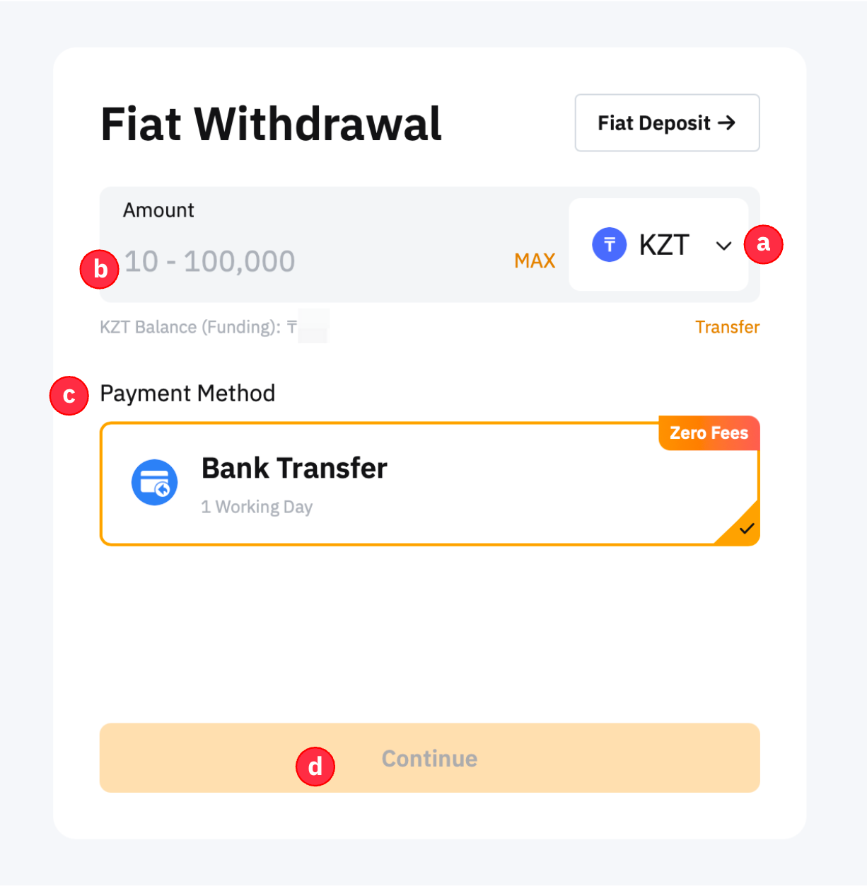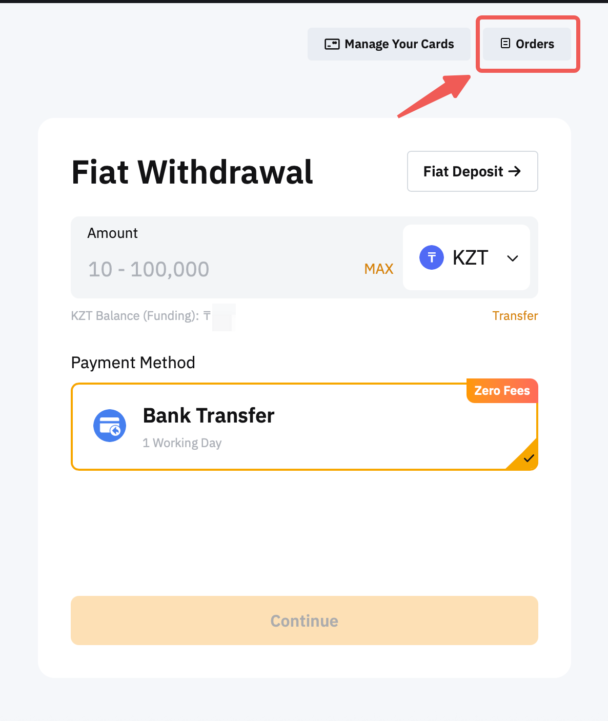 Жеке куәлікті растау және алғашқы депозиттік депозит фиат алу үшін қажет. Егер мұны жасамаған болсаңыз, келесі арқылы жеке куәлікті растауды аяқтаңыз осы нұсқаулық және депозит пен алу үшін банктік шотыңызды қосу үшін бірінші фиат депозитін жасаңыз. Сондай-ақ, аяқтау арқылы фиат алу лимиттерін көбейтуге болады Жетілдірілген Iтісін тексеру. Қосымша ақпарат алу үшін мына сайтқа кіріңіз осы мақала. Қазіргі кезеңде Fiat үшін Business Verification функциясына қолдау көрсетілмейді.