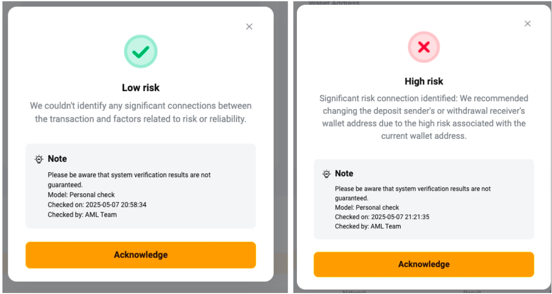 — Тәуекелді бағалау жоғары тәуекел нәтижесін көрсеткен жағдайларда, салым үшін басқа әмиян мекенжайын пайдалану ұсынылады.
