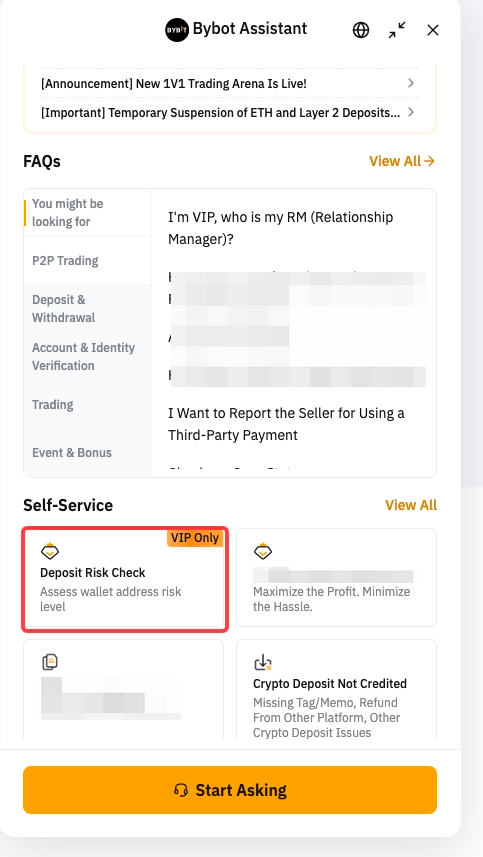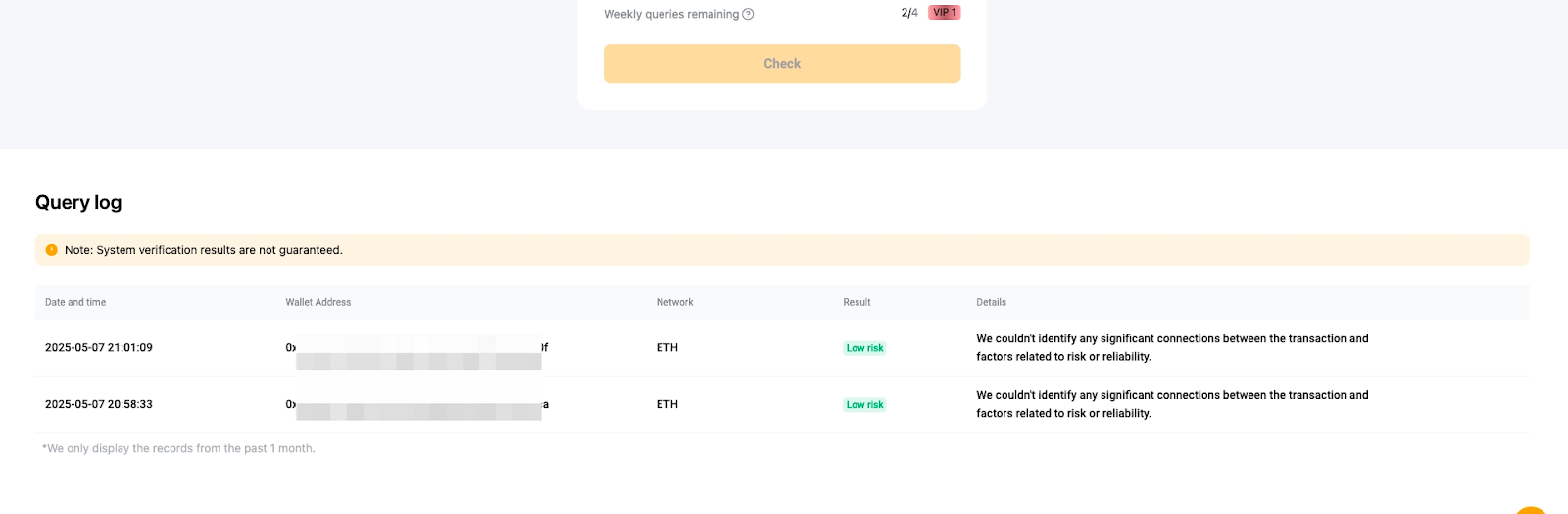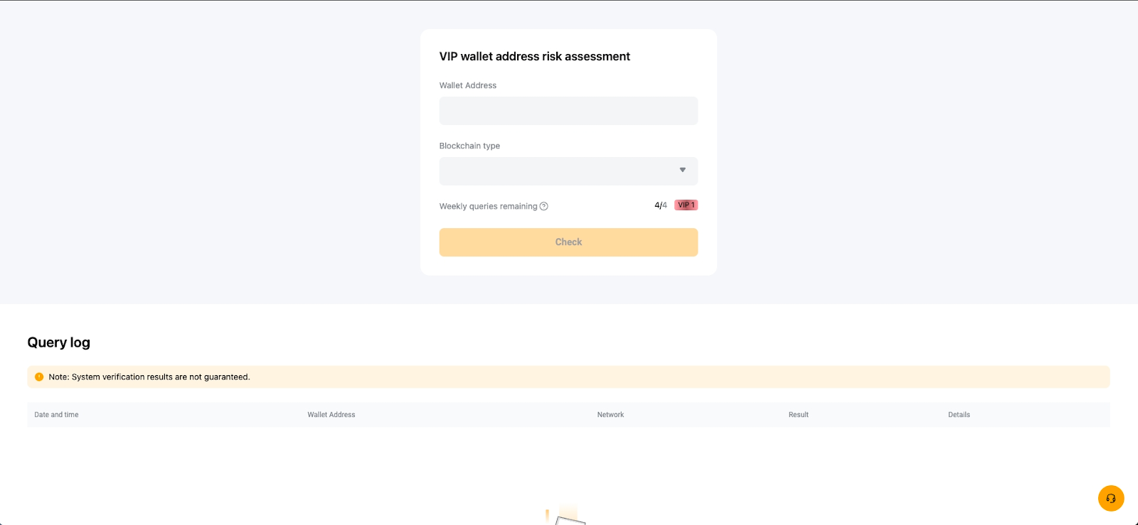 Бұл функция тек VIP пайдаланушыларға қолжетімді. Әрбір VIP деңгейге аптасына шектеулі мөлшерде тәуекелдерді бағалау сұраулары беріледі және сұрау квоталары әр жексенбіде сағат 00:00 (түн ортасы) UTC жаңартылады. Сұрауларды жиірек жасау үшін VIP деңгейіңізді жаңарта аласыз.