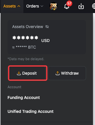 Қадам 1: Активтер бетіне өтіп, «Депозит» батырмасын басыңыз → Криптоны депозитке салыңыз.