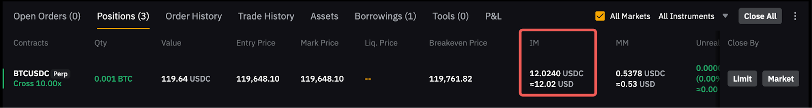 Бұл жағдайда позиция үшін бастапқы маржа (2 525 + 12,375) немесе 2 537,375 USDC құрайды.