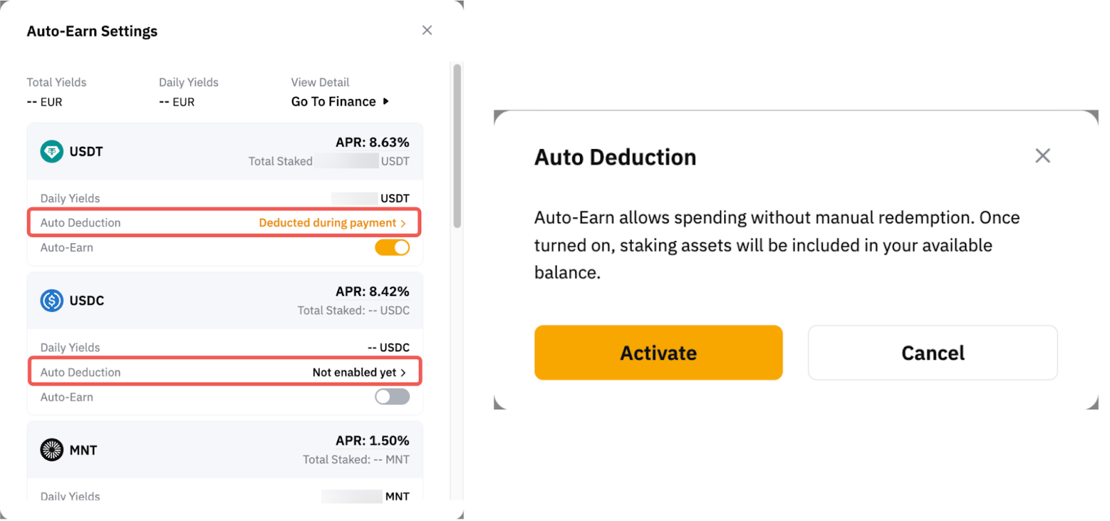Авто-Табыс функциясын қосу келесі күні сіздің Төлем криптовалюталық активіңіздің (әр валютаға көрсетіледі) аударымды балансын Икемді Мерзімді жоспарларға жазылуға автоматты түрде пайдаланады.