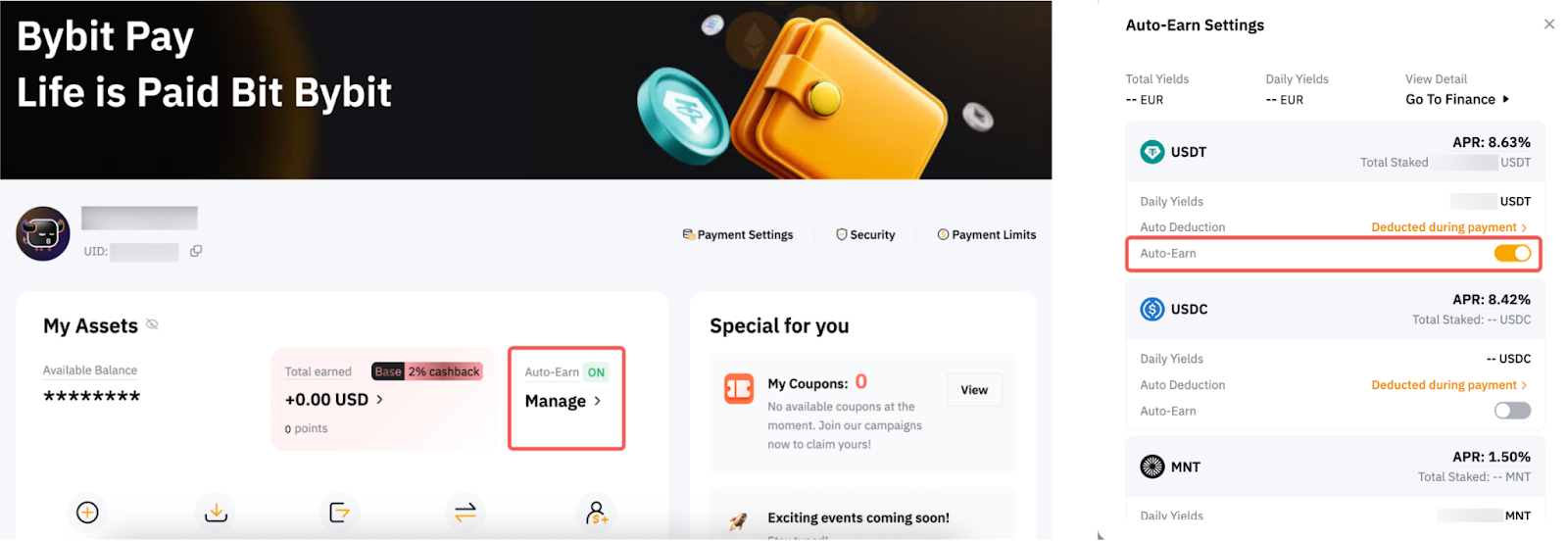 Bybit Pay Kazakhstan панелі арқылы қолжетімді Авто-Еarn функциясы, Bybit Pay Kazakhstan пайдаланушыларына икемді мерзімді активтерінде пайда табуға мүмкіндік береді, оларды Bybit Pay Kazakhstan-мен төлеу үшін автоматты түрде сатып алу мүмкіндігі болғанда.