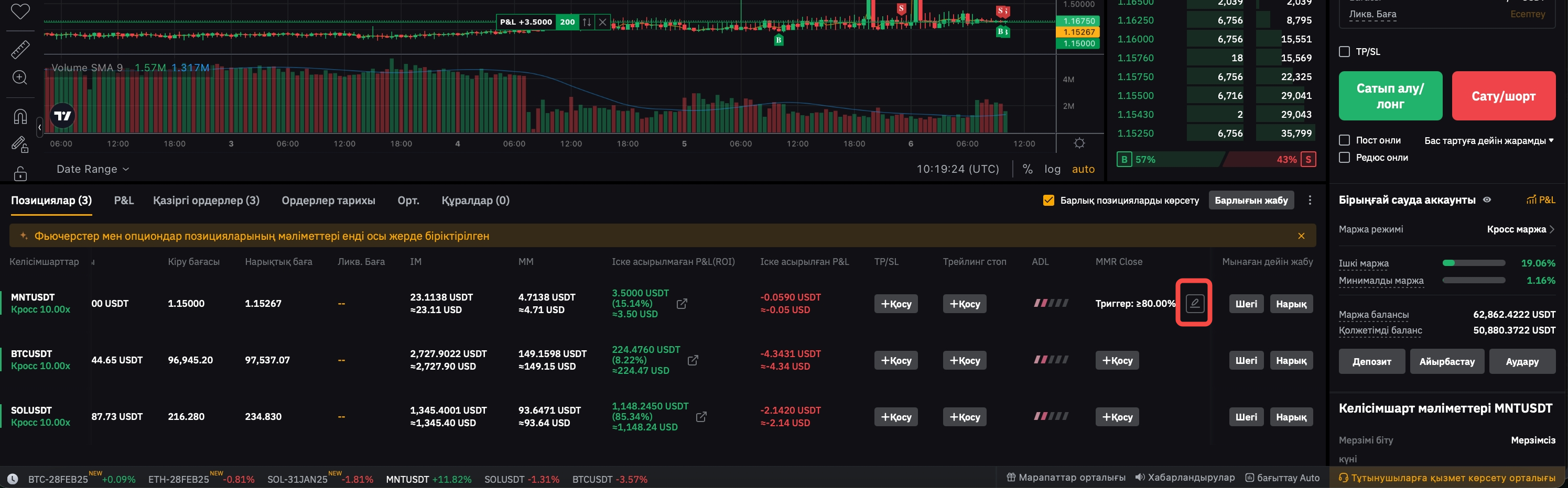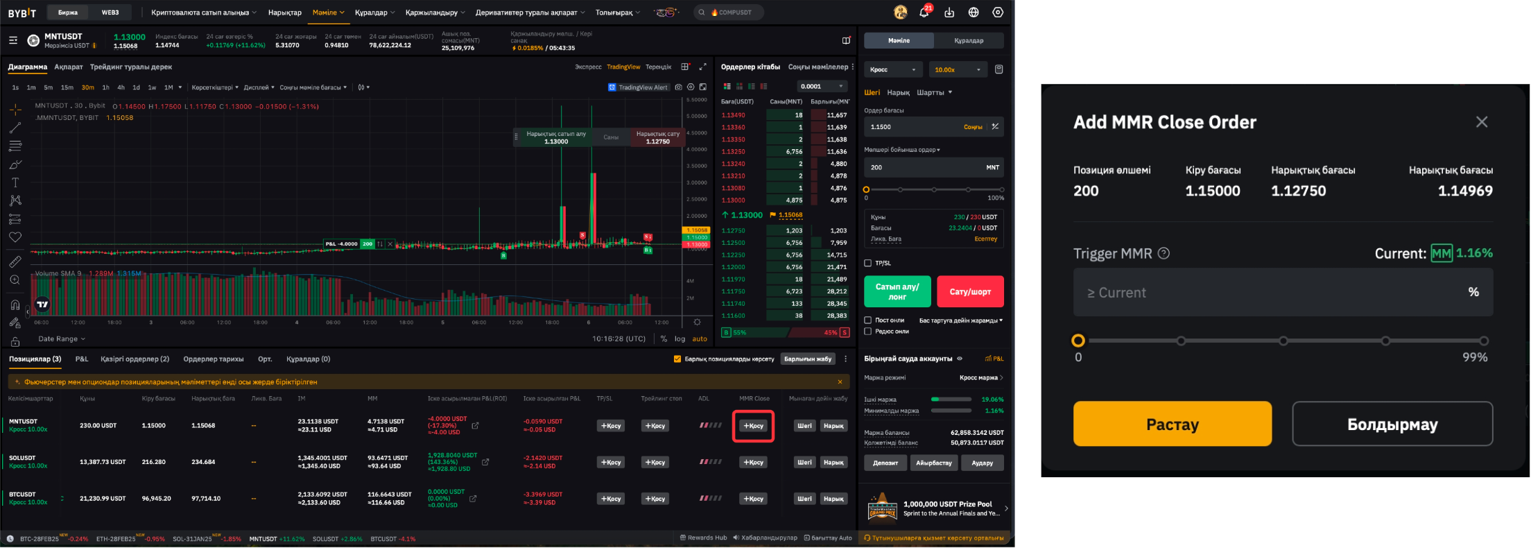 Тәуекелдерді басқарудың жан-жақтырақ шешімін қабылдау қажеттілігін мойындай отырып, Bybit UTA үшін минимал маржа мөлшерлемесін (MMR) жабу ордерін таныстырды. Бұл құрал трейдерлерге криптовалюта саудасына тән құбылмалылықтан сенімді қорғауды қамтамасыз ете отырып, өз аккаунтарының тәуекел профилін белсенді бақылауға мүмкіндік береді.