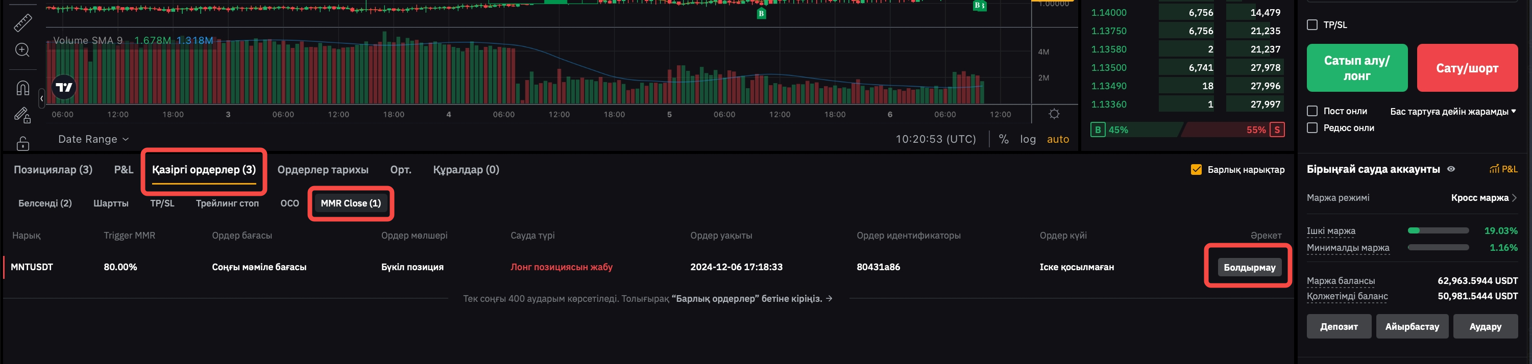 MMR ордерін жою үшін “Қазіргі ордерлер” қойындысында бар MMR жабу ордерінің мәліметтерін көріп, “Жою” батырмасын басуға болады.