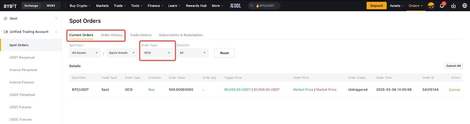 Немесе өзіңіздің сайтыңызға өтіңіз Бірыңғай сауда шоты тапсырыстары бет → Spot тапсырыстары → Ағымдағы тапсырыстар немесе тапсырыстар тарихы бет.