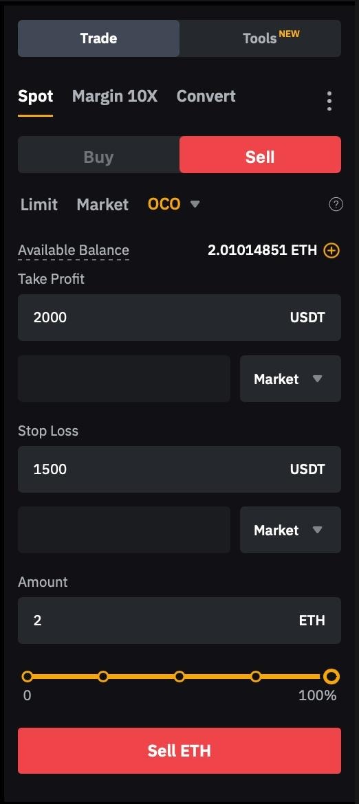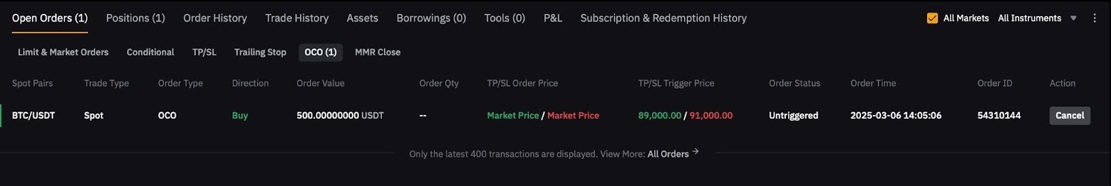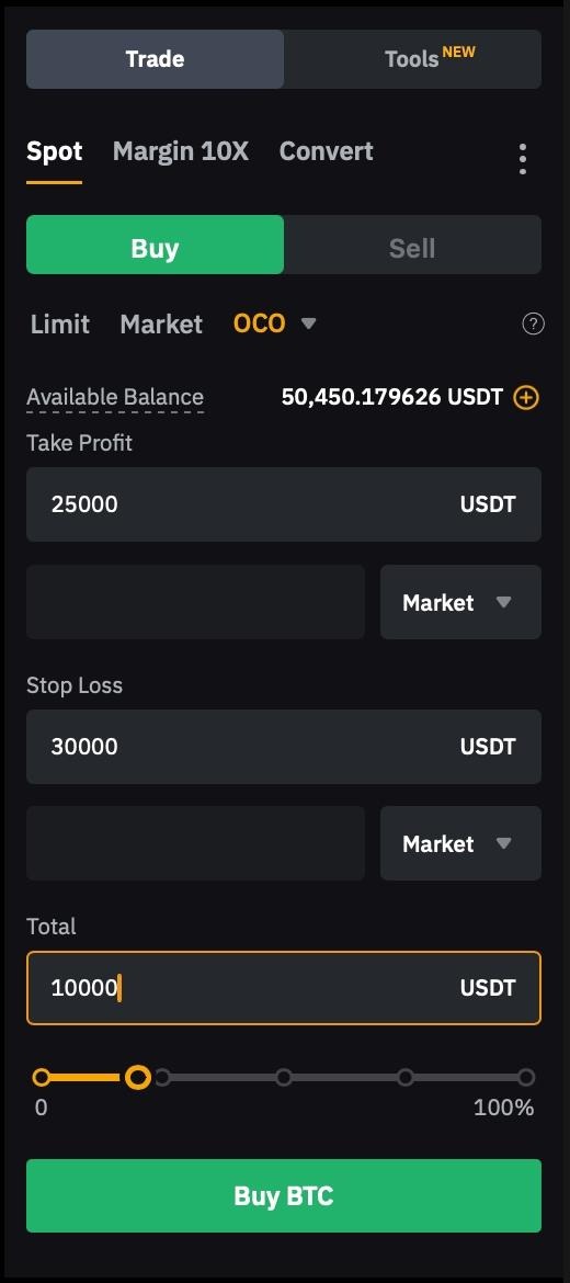 Тек Spot және Spot Margin Traders үшін: OCO тапсырыстары тек Spot немесе Spot Margin саудасымен айналысатын пайдаланушылар үшін қол жетімді.