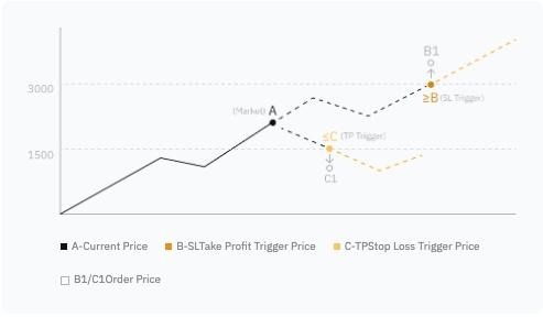 Егер ETH бағасы 2000 долларға дейін көтерілсе, трейдер В-ның Take Profit тапсырысы іске қосылады және оның ETH нарықтық бағамен сатылады. 1500 АҚШ доллары көлеміндегі тиісті Stop Loss тапсырысы алу пайдасына қол жеткізілгеннен кейін автоматты түрде жойылады.