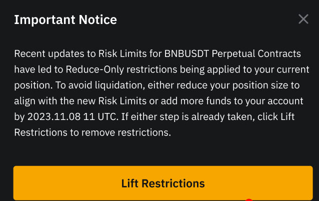 10 күндік буферлік кезең аяқталғанда, жүйе жаңа тәуекел параметрлерін сауда жұбына автоматты түрде қолданады, бұл сізге позицияларды қайтадан ашуға мүмкіндік береді. Дегенмен, сіздің жағдайыңыз түзетуден кейін жою қаупіне ұшырауы мүмкін екенін ескеріңіз. Сондықтан, кез келген ықтимал жою тәуекелін азайта отырып, 10 күндік буферлік кезең ішінде жаңа тәуекел параметрлеріне сәйкестендіру үшін қосымша қаражат аудару арқылы позицияңызды немесе шот тәуекеліңізді басқару ұсынылады.