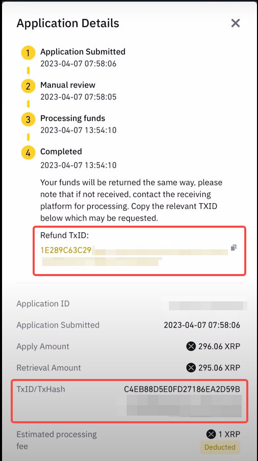 Ескерту: Бізге толық қайтарылған TXID көрсетуді ұмытпаңыз. TXID толық көрсетілмесе, TXID сілтемесін басыңыз, сонда сіз сәйкес блокчейн зерттеушісіне қайта бағытталасыз.