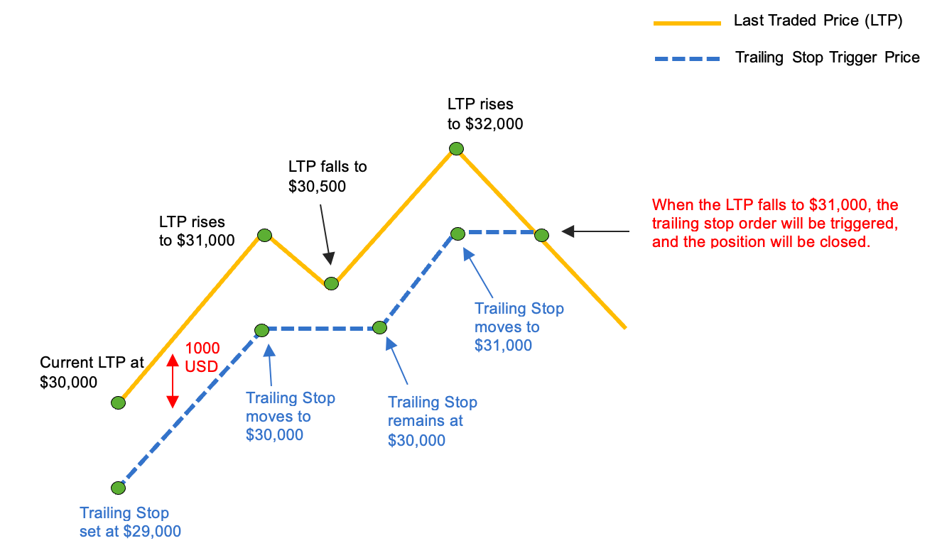 Егер соңғы саудаланған баға ешқашан $30 000 аспаса, Trailing Stop әдеттегі тоқтату жоғалтуына ұқсас $29 000-да іске қосылады.