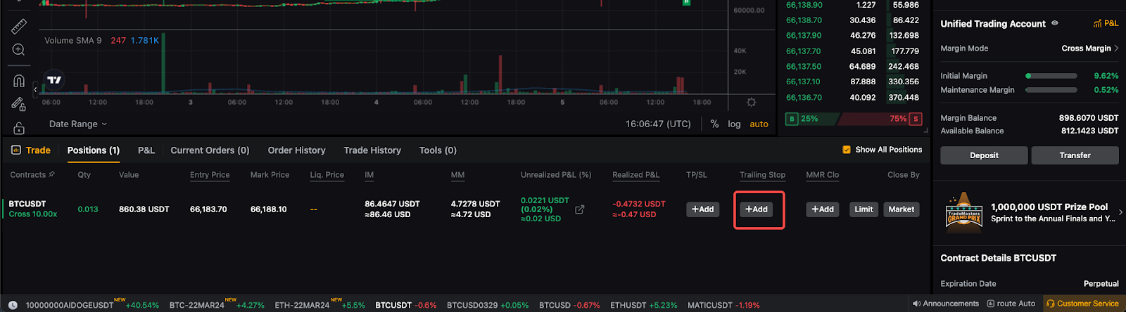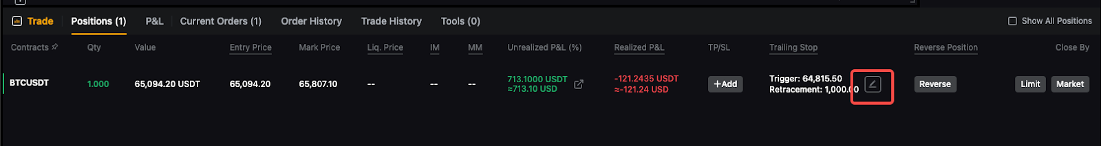 1-қадам: Мәңгілік және фьючерстік сауда бетінде ашылған позицияңызға өтіп, түймесін басыңыз қосу Trailing Stop астында.