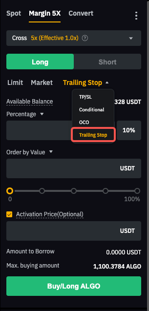 — Trailing Stop мүмкіндігі тек Бірыңғай сауда тіркелгісінің пайдаланушылары үшін Spot & Spot Margin Trading үшін қол жетімді).