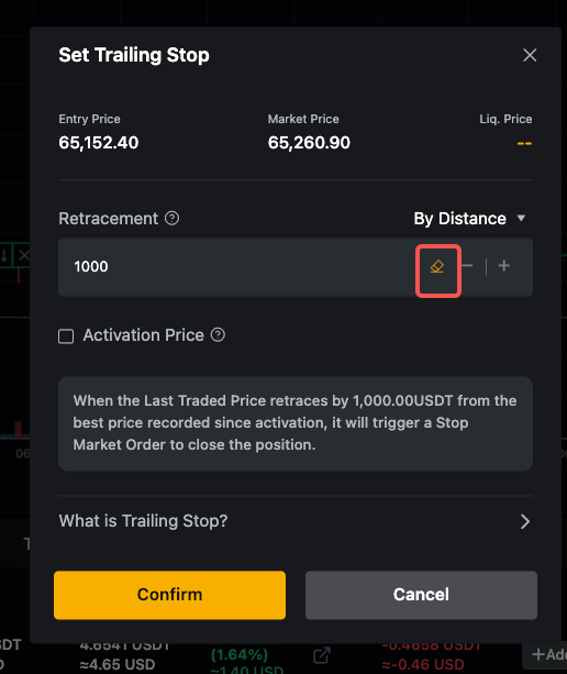 Trailing Stop тапсырысынан бас тартқыңыз келсе, түймесін басыңыз өшіргіш қалпына келтіру жанындағы белгішені басып, түймесін басыңыз Растау.