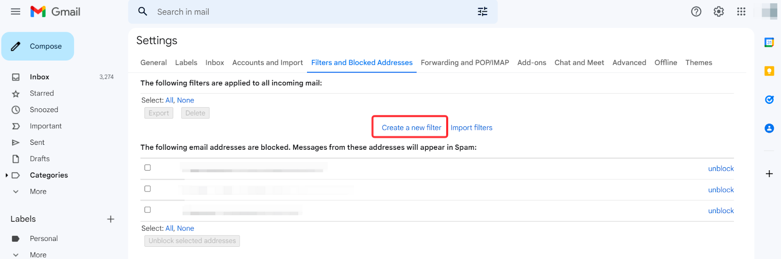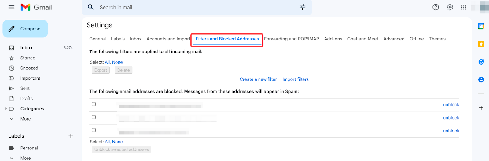 1-қадам: Gmail тіркелгісінің параметрлерін басып, таңдаңыз Сүзгілер және бұғатталған мекенжайлар.