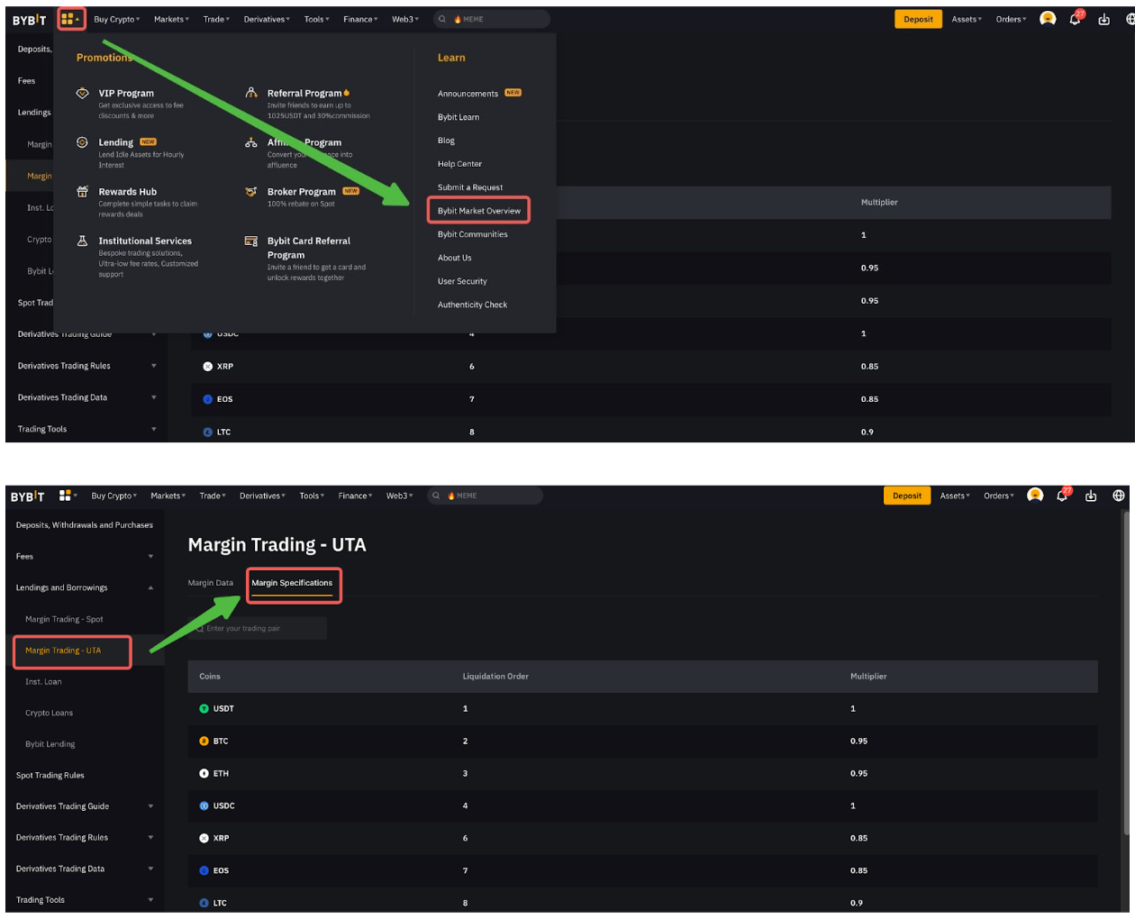 Для просмотра коэффициента стоимости обеспечения по каждой монете в рамках Единого торгового счета перейдите к значку "Приложение" в левом верхнем углу и выберите пункт "Обзор рынка Bybit".