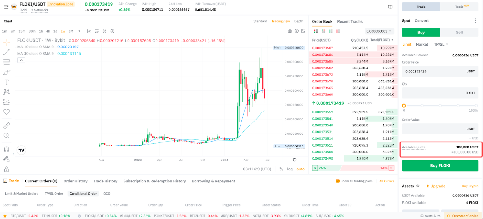 Для иллюстрации квота ордера для FLOKI составляет 100 000 USDT, а рыночная цена — 0,00017. Максимальное количество, которое пользователи могут купить на спотовом рынке, составляет 571 428 571 FLOKI (100 000/0,00017). После достижения этой квоты разрешается использовать только ордера на продажу. Любое увеличение стоимости из-за депозитов или изменения цены после достижения квоты не ограничено. Квоты ордеров можно посмотреть в окне спотового торгового ордера.