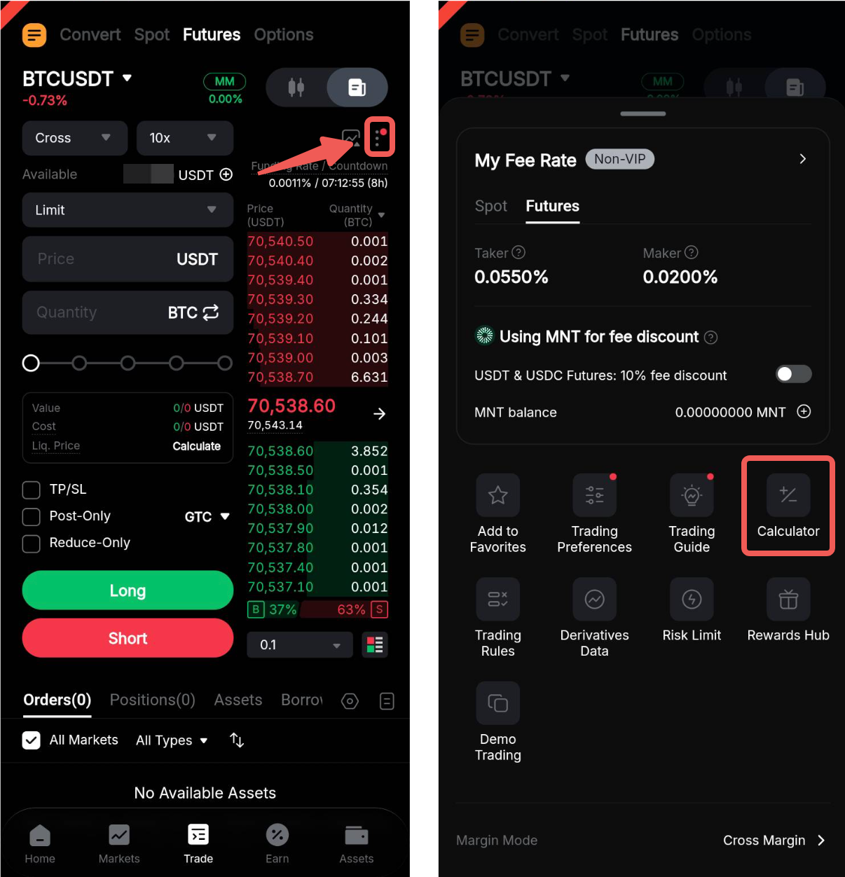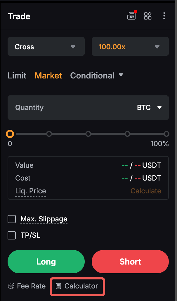 Шаг 1: В веб-версии калькулятор Bybit Kazakhstan можно найти в левом нижнем углу зоны ордера. В приложении перейдите в раздел «Торговать» и нажмите на значок многоточия в правом верхнем углу, чтобы открыть страницу настроек торговли.
