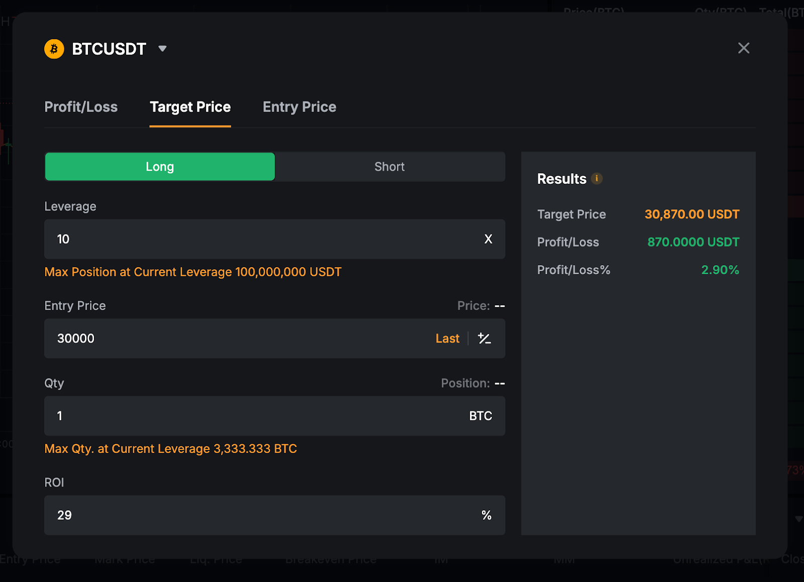 Если ввести приведённое выше значение, можно подсчитать, что для того, чтобы рентабельности инвестиций по позиции достигла 29%, целевая цена тейк-профит (цена выхода) должна быть установлена на уровне около $7280.