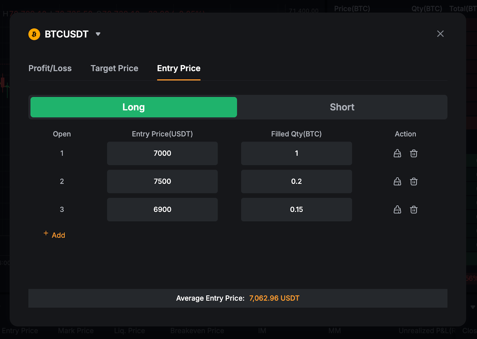 При вводе значений в калькулятор средняя цена входа отображается как 7062,90 USDT.