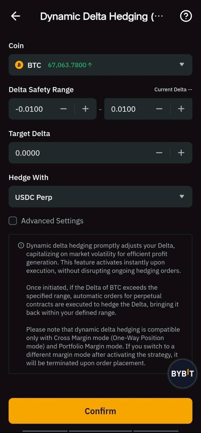 Проверьте все детали и нажмите «Подтвердить». После включения функции динамического дельта-хеджирования её параметры можно будет изменять.