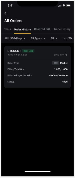 Ордера с соответствующими метками функции динамического дельта-хеджирования можно посмотреть на странице «История ордеров».