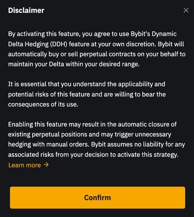 Шаг 2. Чтобы включить эту функцию, нажмите «Динамическое дельта-хеджирование». Прежде чем сделать это, внимательно ознакомьтесь с дисклеймером, чтобы понять риски, связанные с использованием функции динамического дельта-хеджирования.