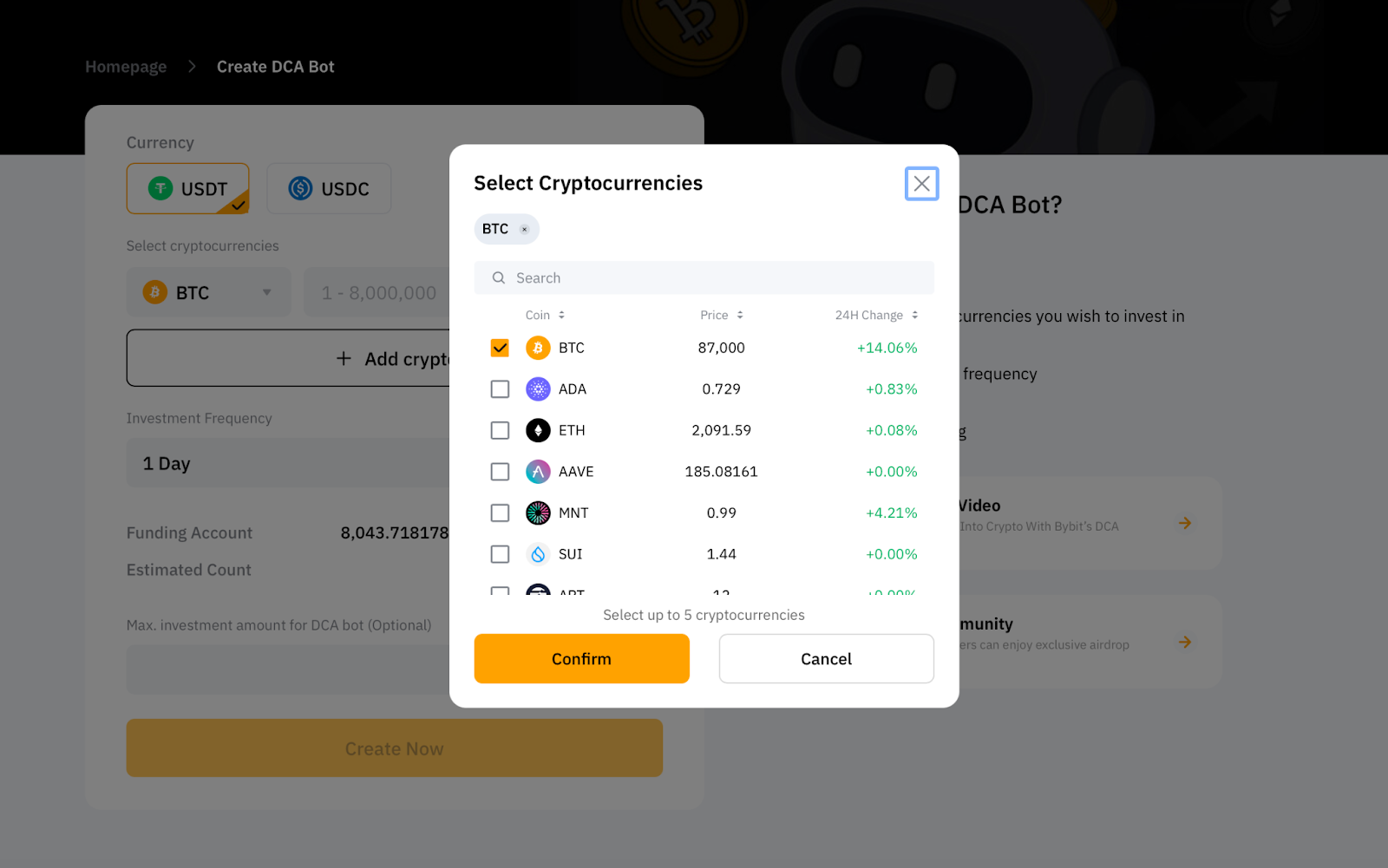 В настоящее время поддерживаются USDT и USDC. Обратите внимание, что один бот DCA не может одновременно использовать две инвестиционные валюты.