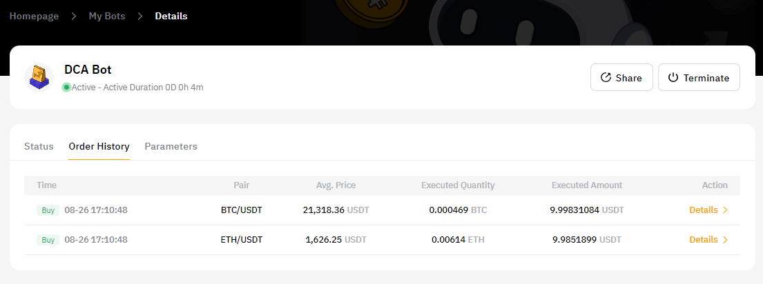 Перейдите в раздел «Мои боты», чтобы просмотреть все активные и завершенные сделки. Нажмите «Сведения», чтобы просмотреть подробную информацию о вашей сделке в разделе «Статус», «История заказов» и «Параметры».