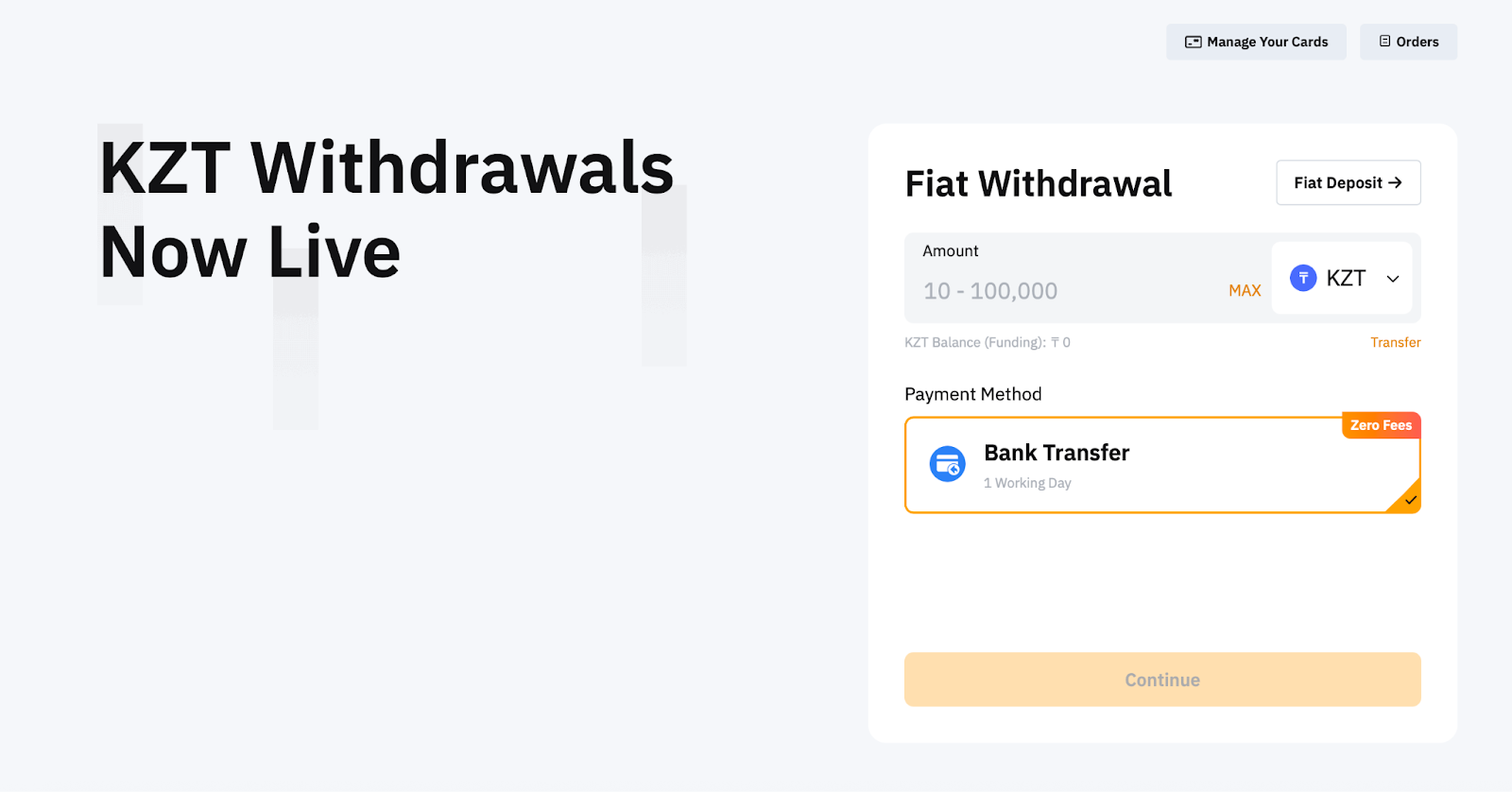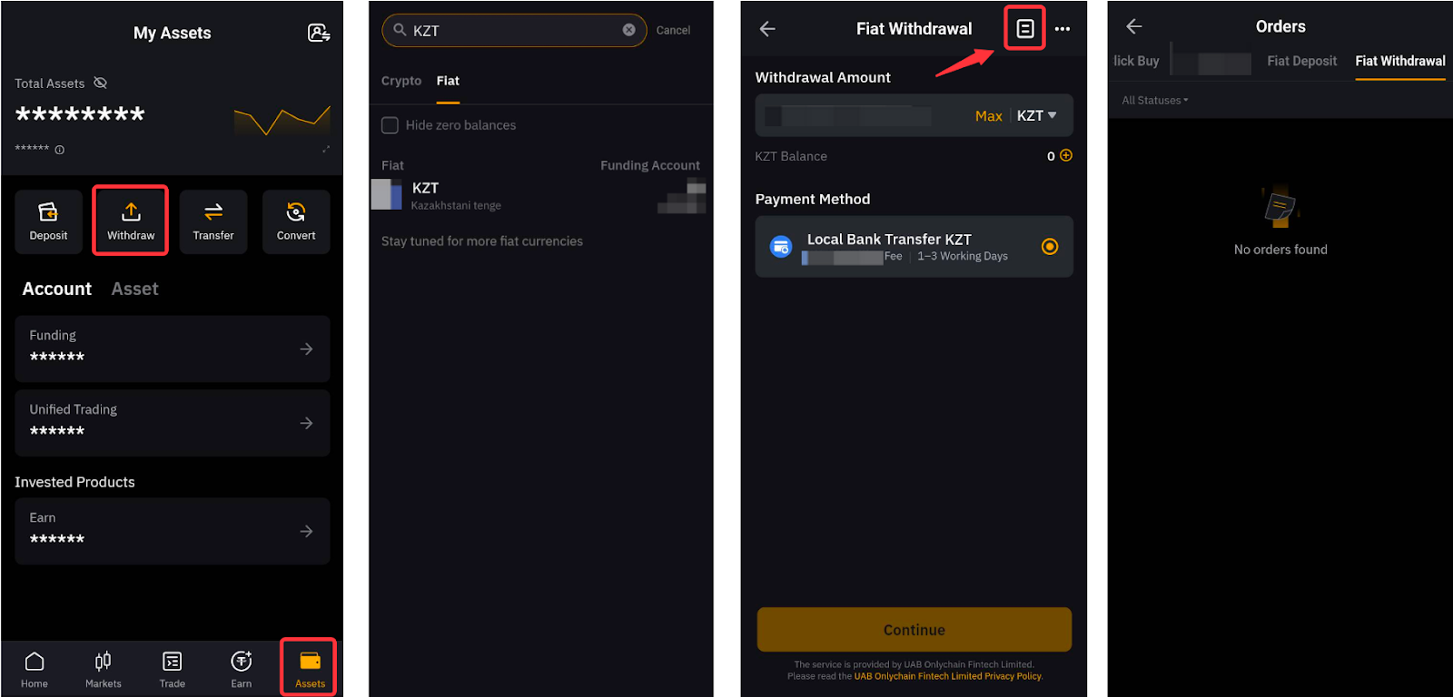 Чтобы просмотреть историю снятия средств fiat, нажмите «Заказы» в правом верхнем углу страницы снятия средств Fiat.
