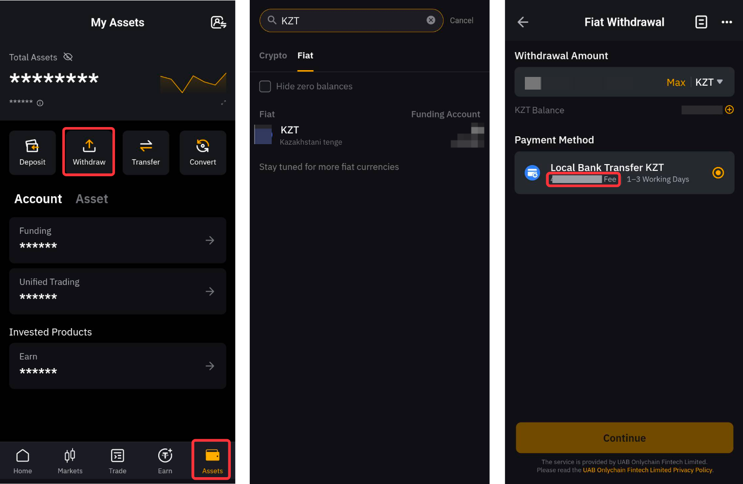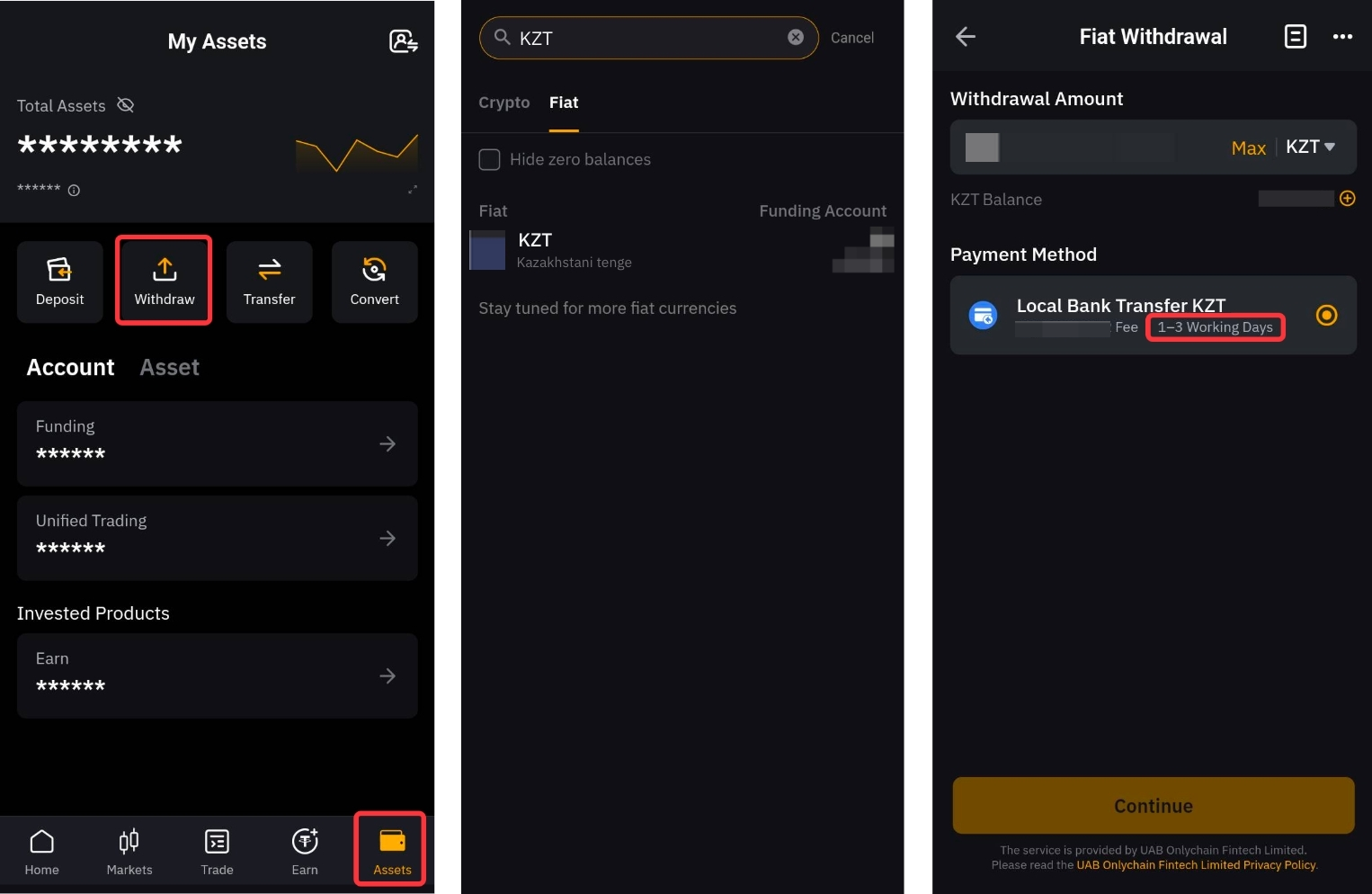 В приложении перейдите на вкладку «Активы» и нажмите «Отозвать», затем перейдите в раздел «Fiat». Затем нажмите Fiat и укажите соответствующее время обработки для каждого способа оплаты.