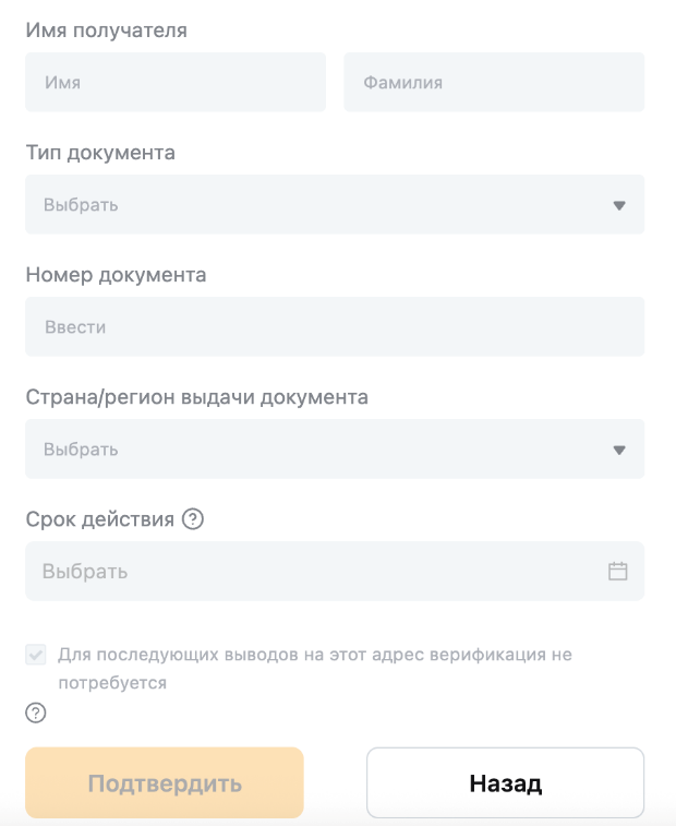 Дополнительная верификация, как правило, не требуется. Вывод будет обработан после того, как система подтвердит совпадение предоставленной информации с данными ПУЦА получателя. Однако в отдельных случаях может потребоваться прохождение верификации адреса кошелька.