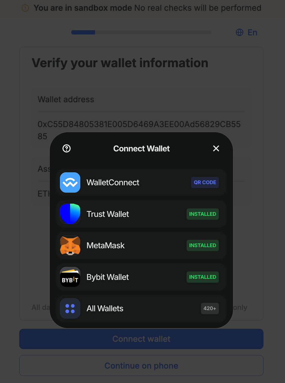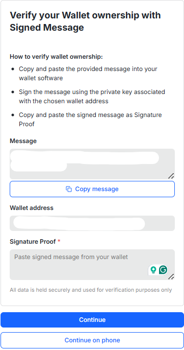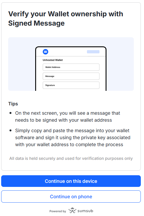 Тип кошелька контрагента | Шаги верификации | Форма подтверждения владения кошельком |