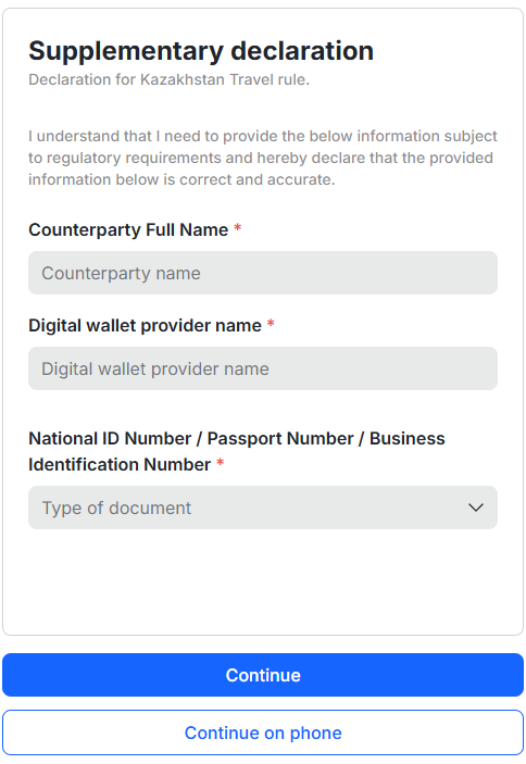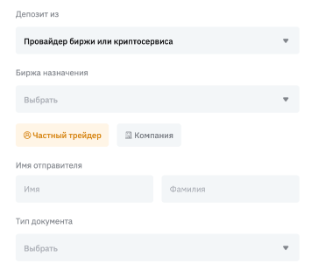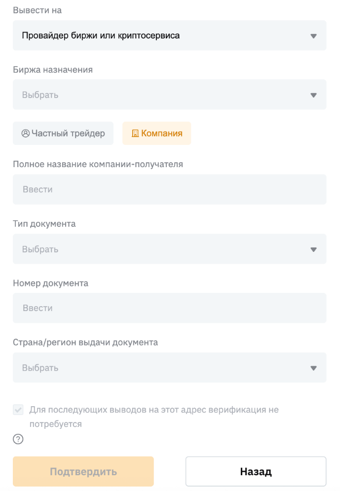 При инициировании транзакции по выводу криптоактивов вам потребуется заполнить форму в соответствии с требованиями Travel Rule.