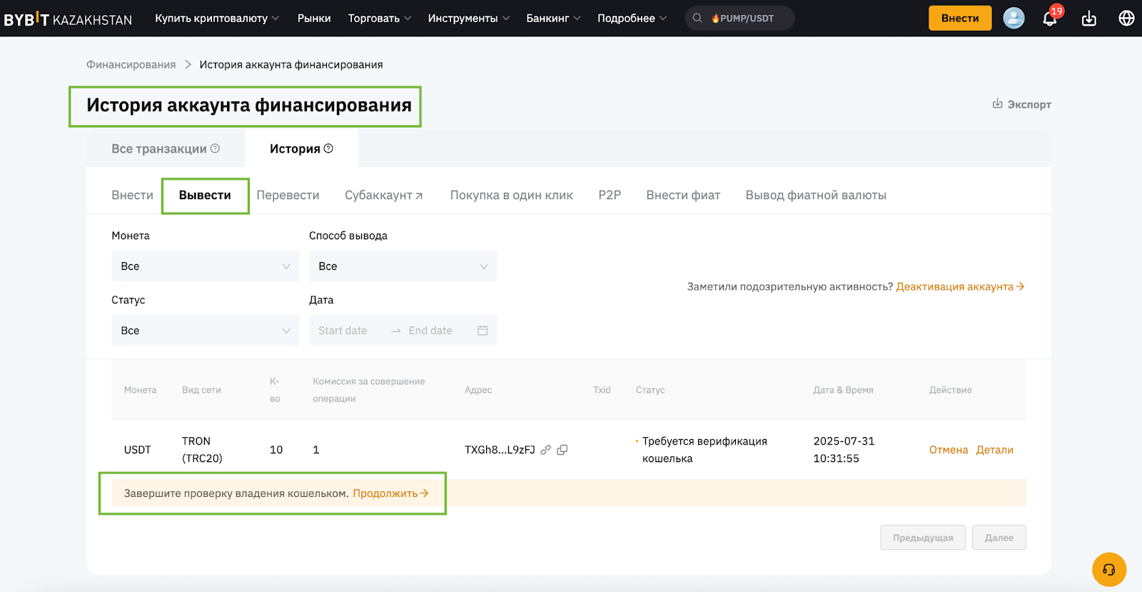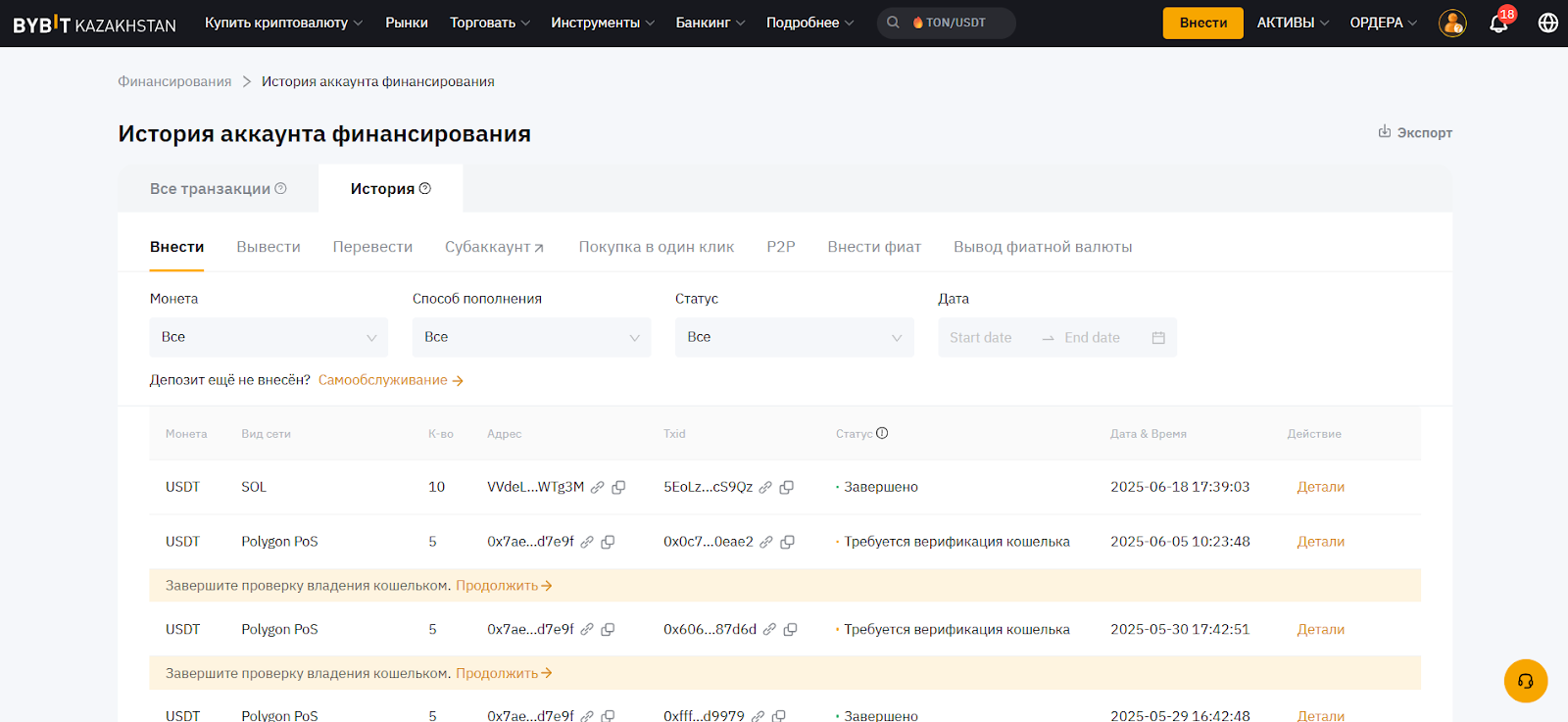 Bybit Kazakhstan потребует от вас заполнить форму декларации. Как правило, подтверждение адреса кошелька не требуется, и криптоактивы будут зачислены на ваш аккаунт после того, как система подтвердит совпадения данных между Bybit Kazakhstan и платформой-отправителем (контрагентом).