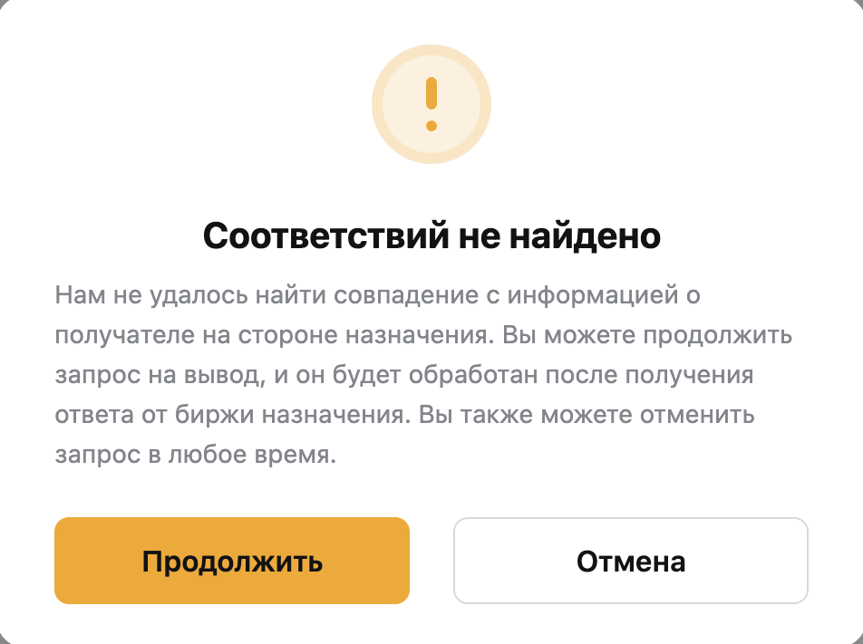 Это может означать, что платформа назначения (или отправитель) ещё не подтвердила сведения об отправителе или получателе. Вы всё равно можете отправить запрос на ввод или вывод — он будет обработан после получения ответа от контрагента (ПУЦА). Вы также можете отменить запрос на вывод в любое время до завершения обработки.