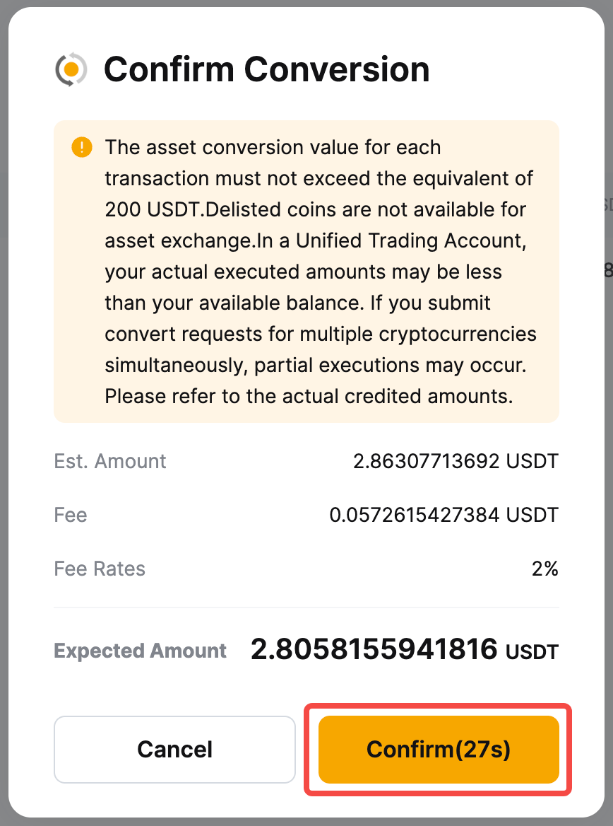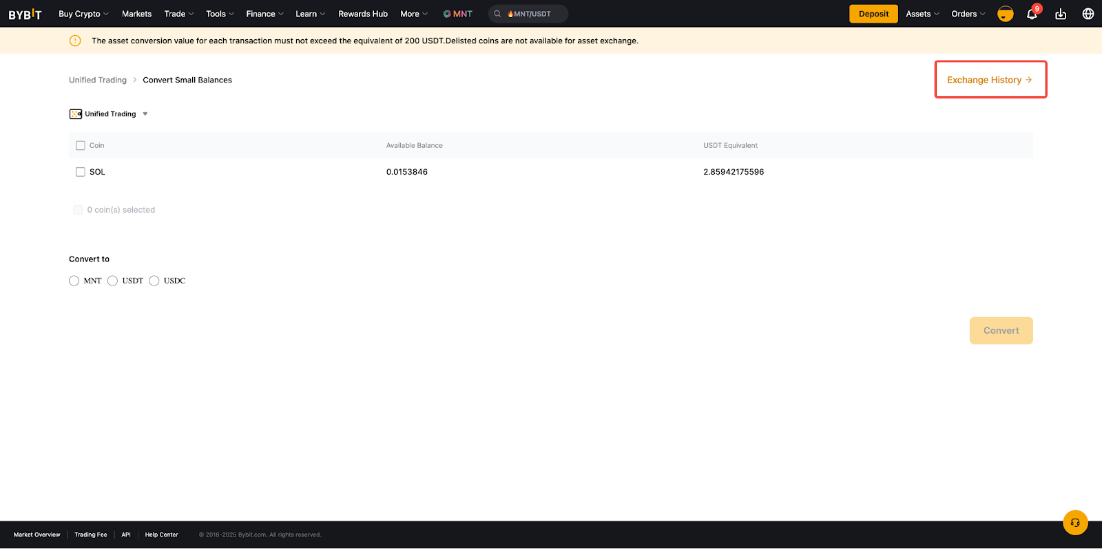 Чтобы просмотреть подробную информацию о конвертации, нажмите История обмена на странице Конвертация небольшого баланса.