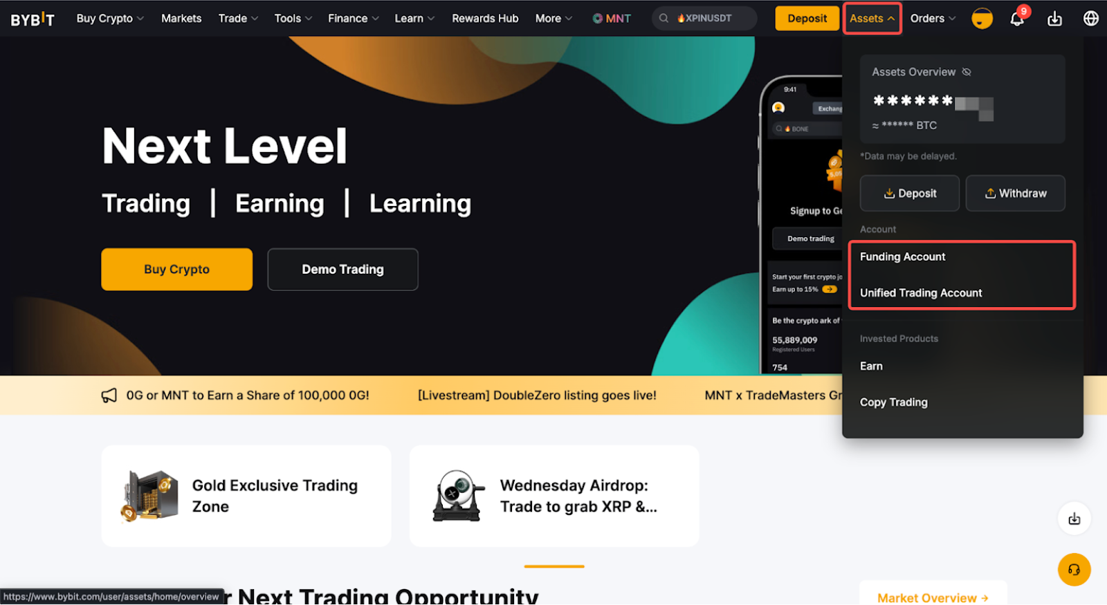 Шаг 1: Нажмите «Активы» → «Аккаунт финансирования» или «Единый торговый аккаунт », чтобы перейти на соответствующую страницу.