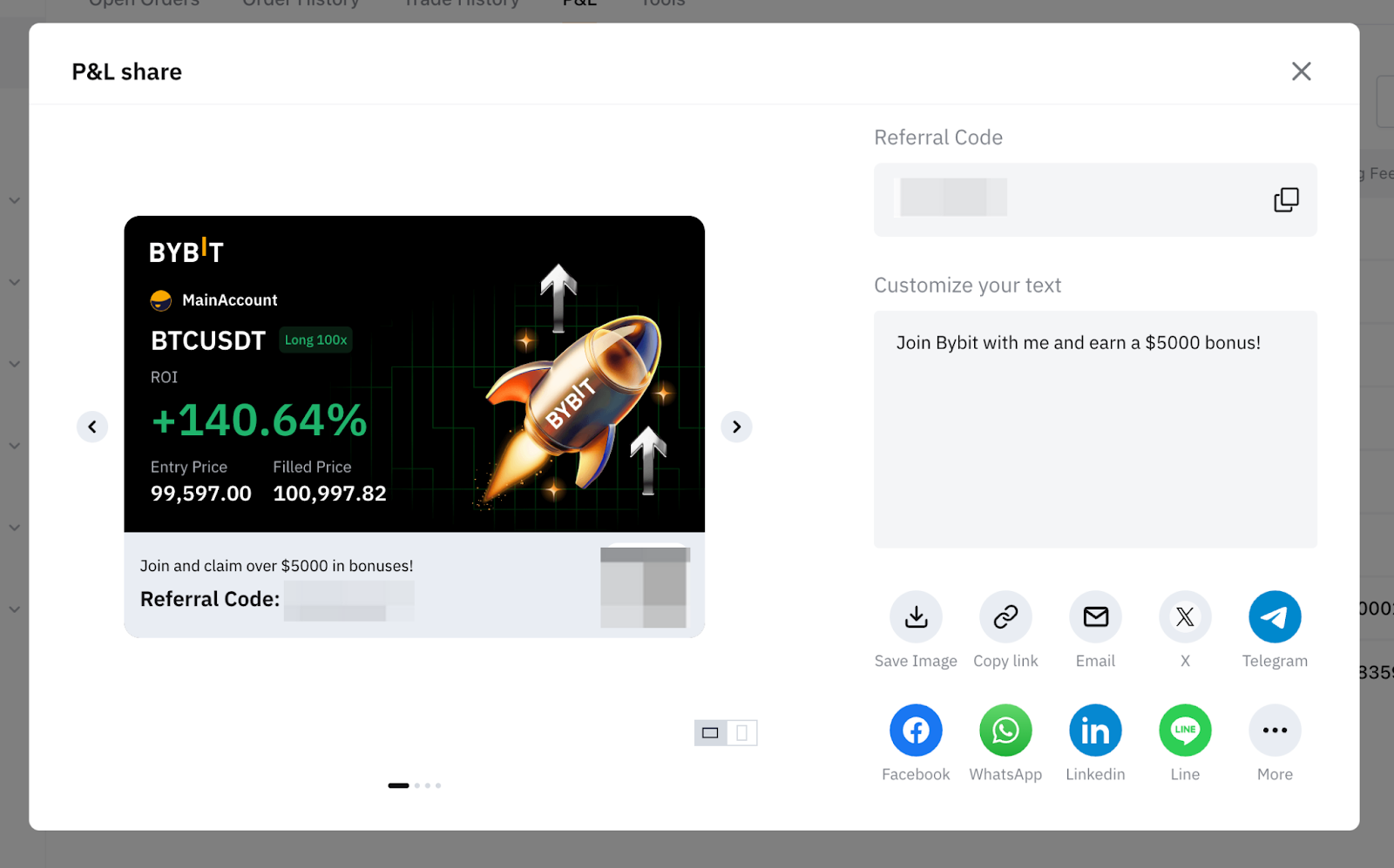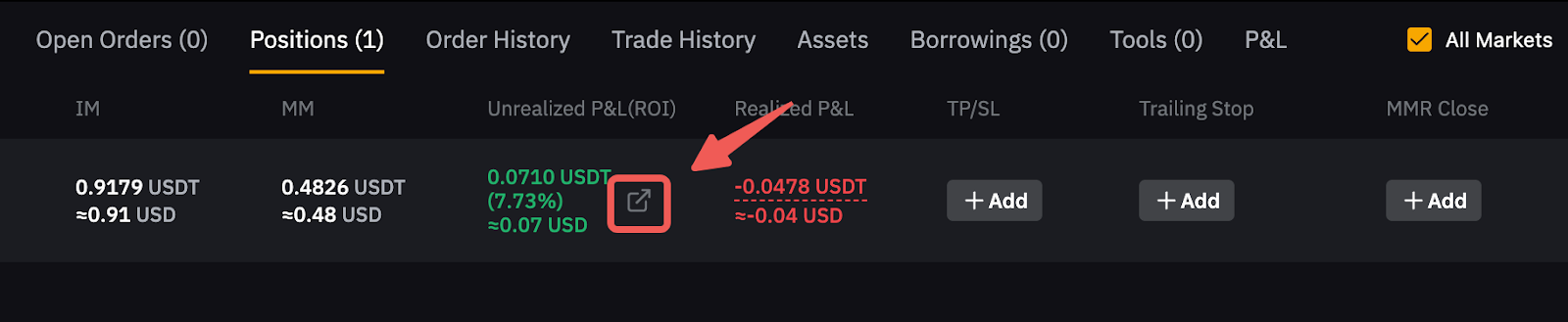 Вы также можете поделиться своим открытым отчетом о прибылях и убытках, перейдя в таблицу должностей под таблицей и нажав на значок «Поделиться» рядом с вашим текущим нереализованным показателем прибылей и убытков.
