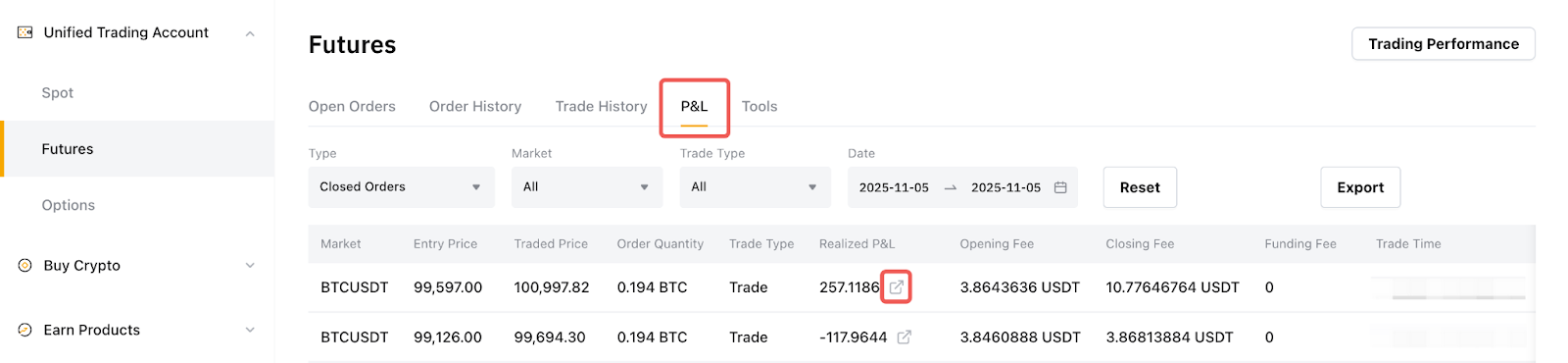 Шаг 3. Выберите соответствующую торговлю производными инструментами на боковой панели и перейдите на вкладку «Прибыли и убытки», чтобы найти закрытый отчет о прибылях и убытках, которым вы хотите поделиться.