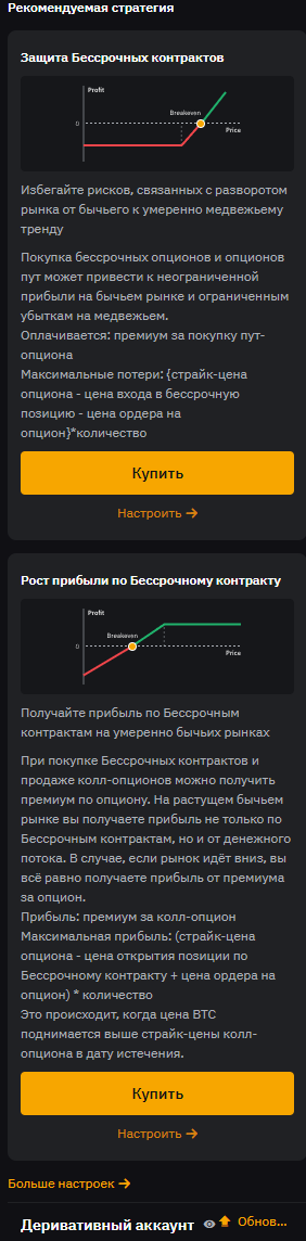 Стратегии защиты бессрочных контрактов и роста прибыли по бессрочному контракту похожи на стратегии защитного пута и покрытого колла. Подробнее об этих стратегиях можно узнать в следующих статьях:
