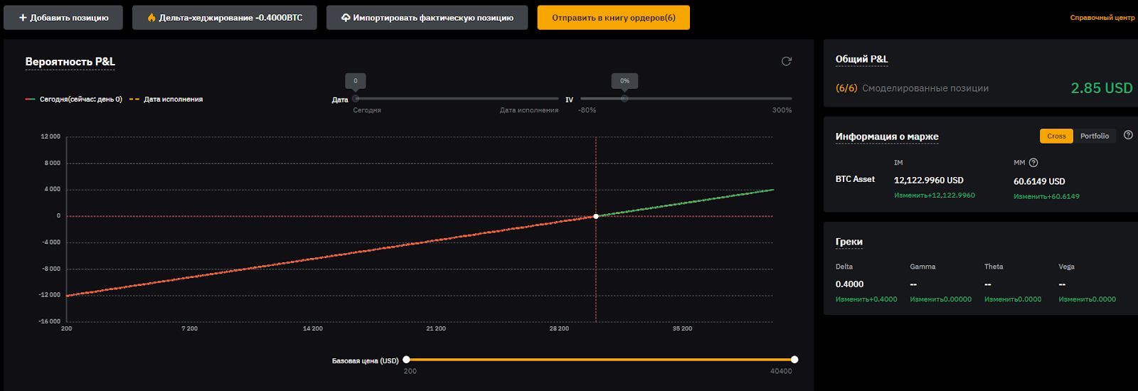Для дальнейшей настройки стратегий можно использовать дельта-хеджирование. Если стратегия предусматривает дельту, вы увидите доступную сумму хеджирования и сможете компенсировать её путём добавления соответствующих деривативов, чтобы обеспечить дельта-нейтральную позицию.