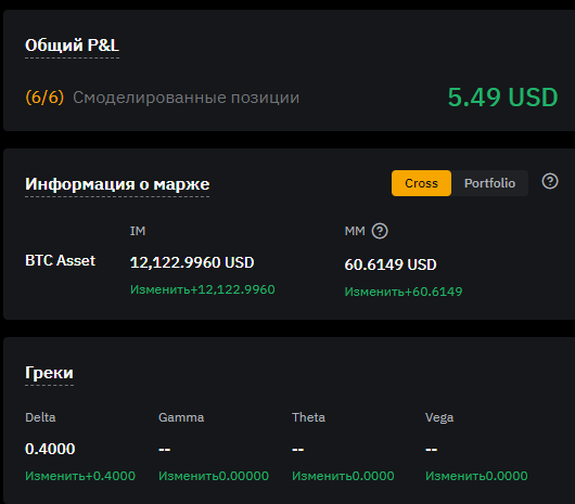 В правой части страницы отображается основная информация, такая как общие прибыль и убыток по смоделированной позиции, маржа и греки.